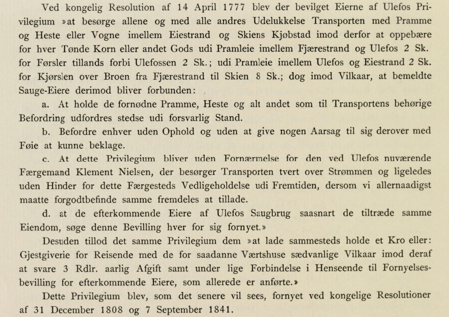 I 1777 får eieren av Ulefos einerett på skysstrafikken mellom stranda ved Eie og Skien by. Detta har trulig vært lukurativt. Clemmet Nielsen er alt i gang med sin fergetrafikk over strømmen og han skulle ikke få noen hindringer ved oppstarten av transportruta. I tillegg skulle han få drive gjestegiveri! Les meir om fergetrafikken og gjestegiveriet i bolken «Bruene ved ulefossen og elvekryssing i gammal tid».