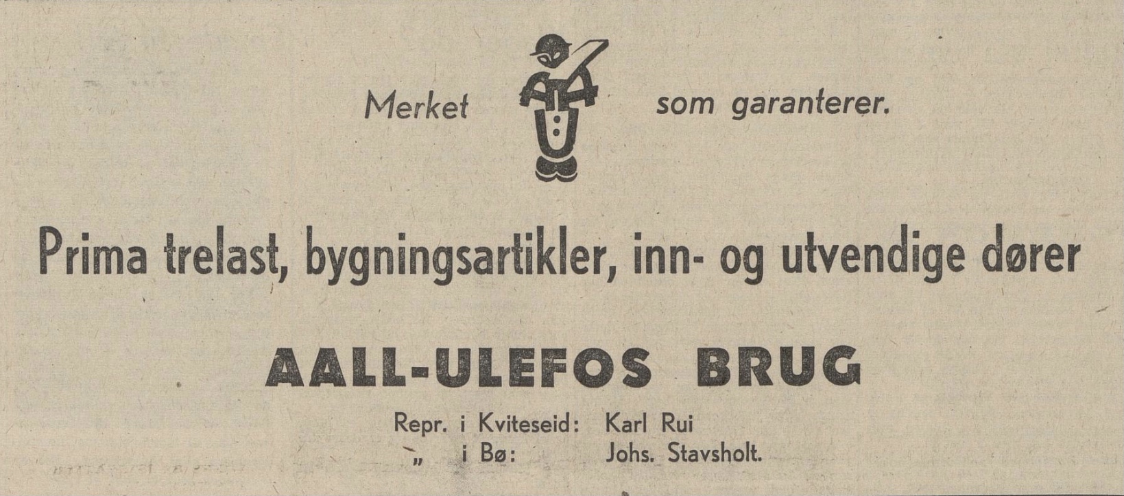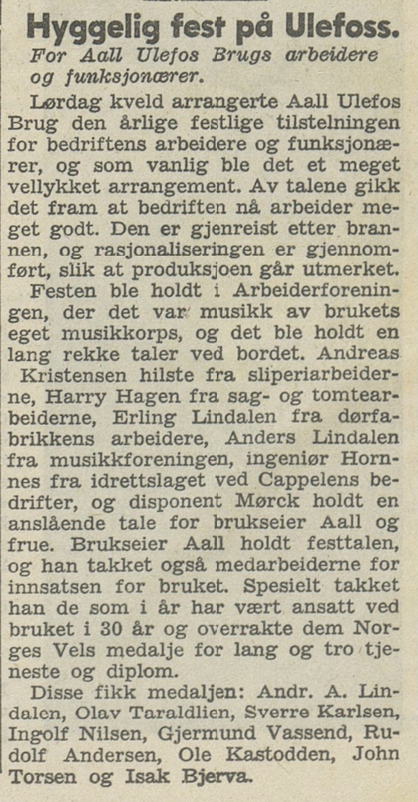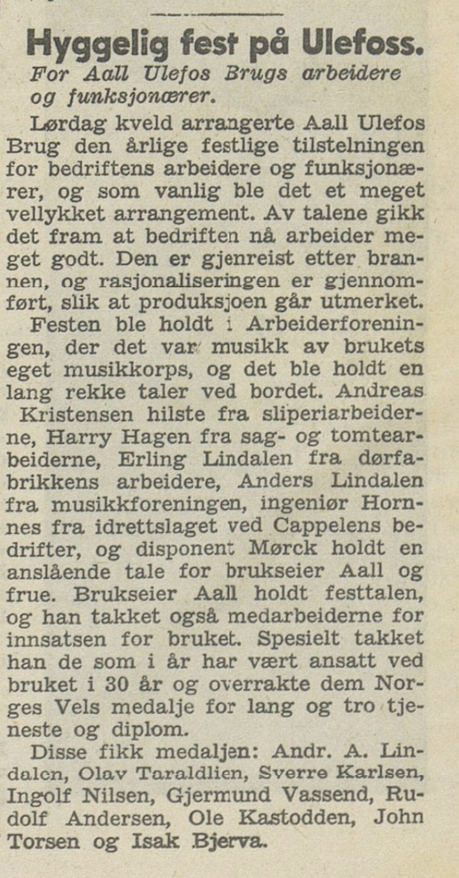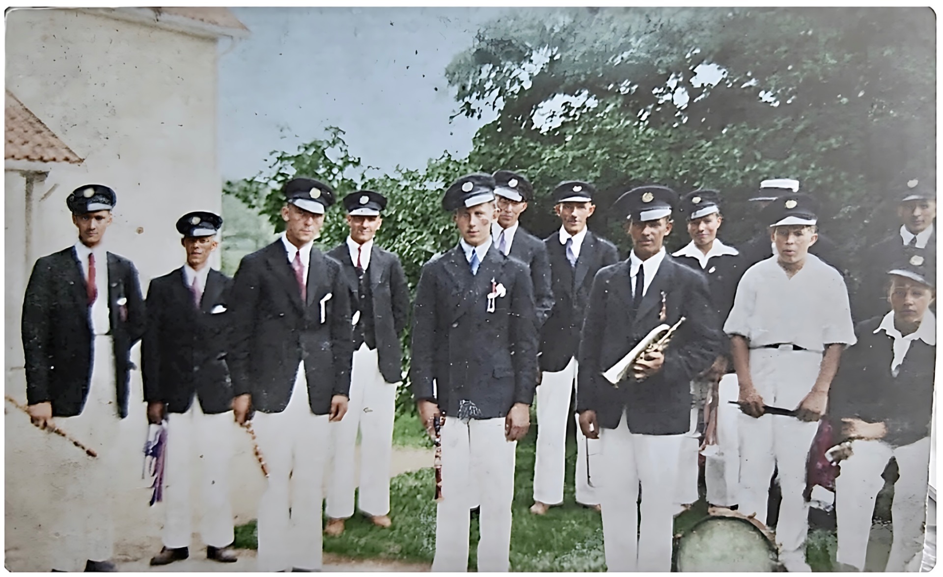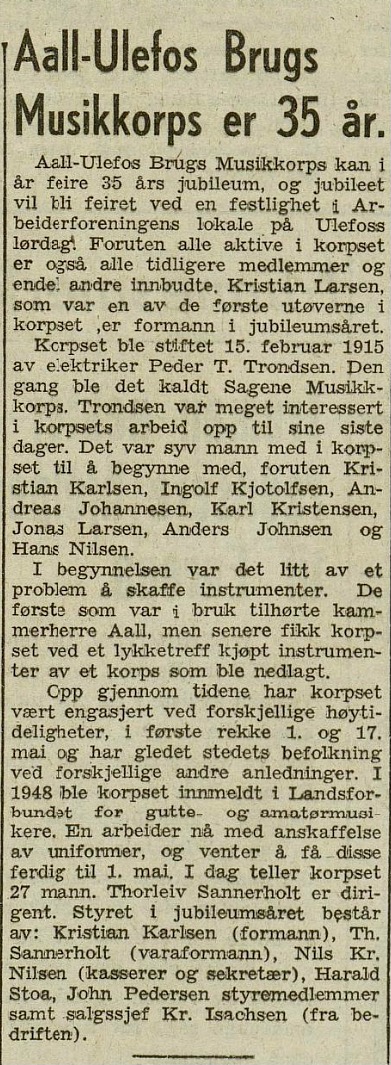 1930. Aall Ulefos Brug sin musikkforening. Vi ser fra venstre: Ingolf Nilsen - Asbørn Odden - Ludvig Nilsen - Axel Nilsen - Håkon Pedersen - Karl Nilsen - Karl Kristensen - Andreas Johannesen - Anders Lindalen - Halvor Lindalen - Alfred Pedersen - Anders Johnsen. Bak med stråhatt står Peder Tronsen.