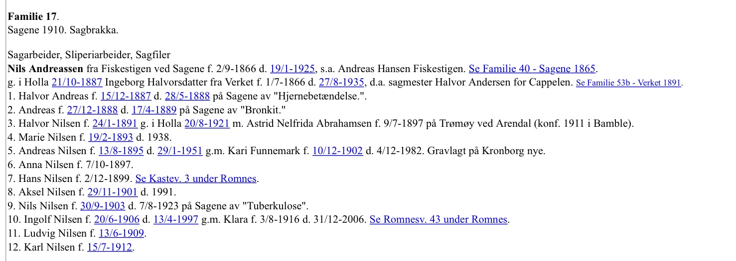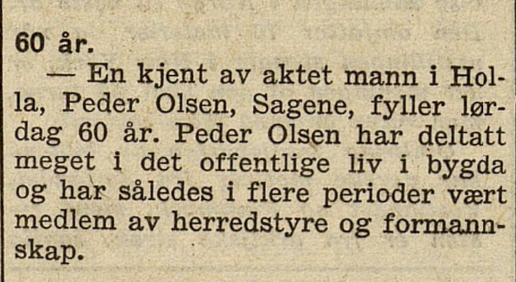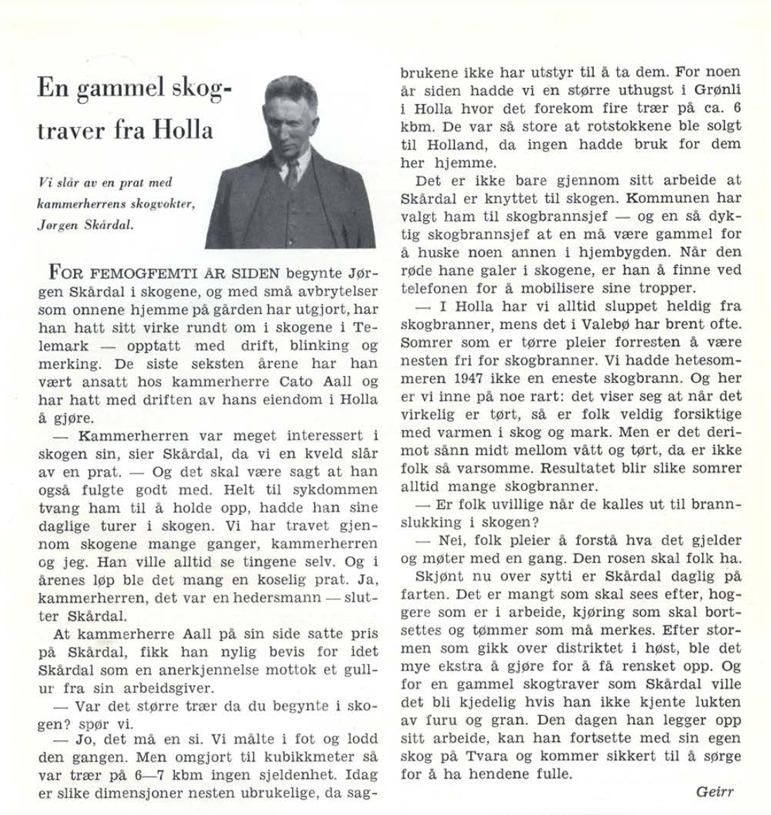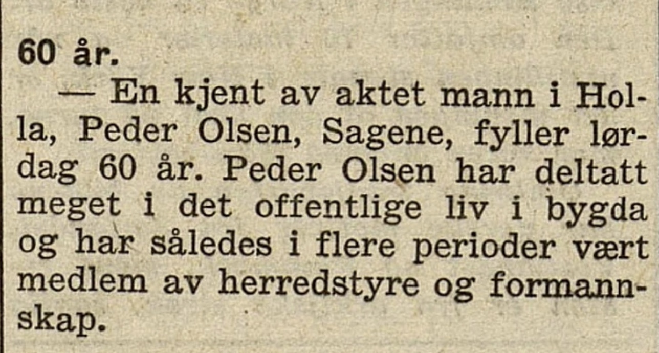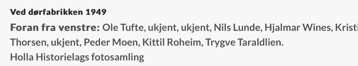 Detta er flotte kilder og jeg vil i tillegg løfte fram Geir Helge Nilsen. Uten ham hadde ikke detta blitt som det har blitt. Han har delt villig med seg av all den kunnskapen han sitter på om Sagene fra sin egen oppvekst og stoff han har tilegna seg i voksen alder. Han har som Per Bernt Tufte mange anekdoter og lokale navn som er viktig å registrere for ettertida. Geir Helge har også bidratt med skattar fra egne fotoalbum. Han har vært min veileder i et vanskelig landskap av Holla si historie. I teksten vil det komme opplysningar som står i hermetegn. Detta er ikke direkte sitat fra Geir Helge, men hans informasjon.