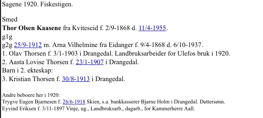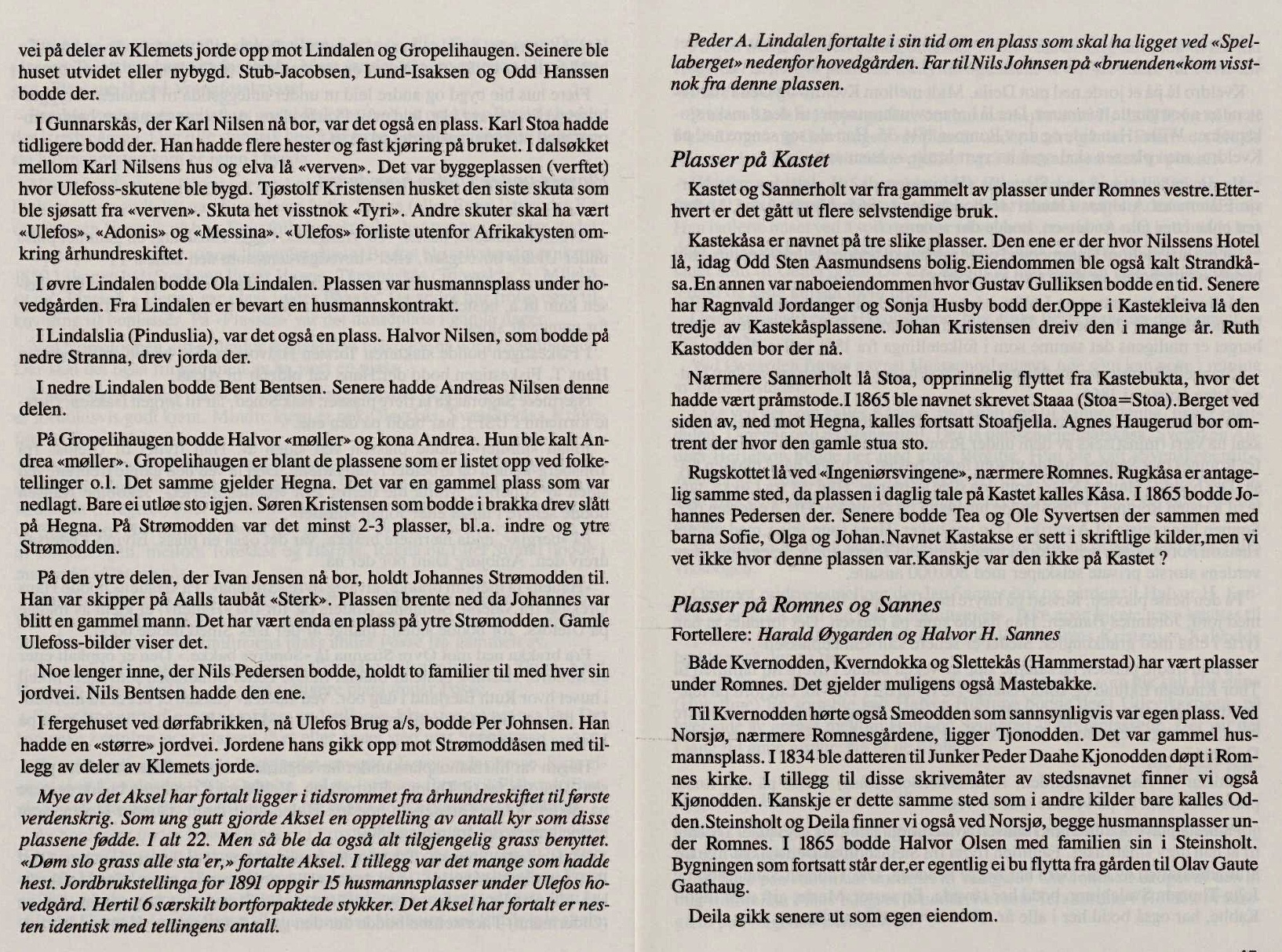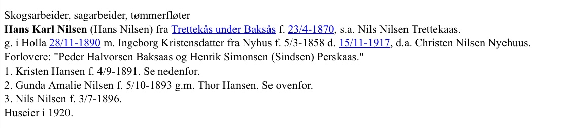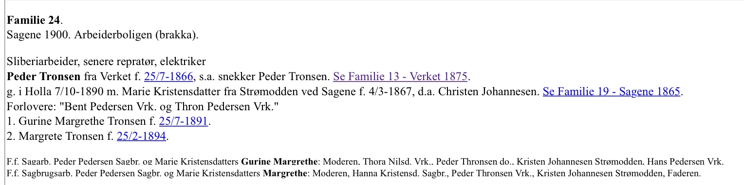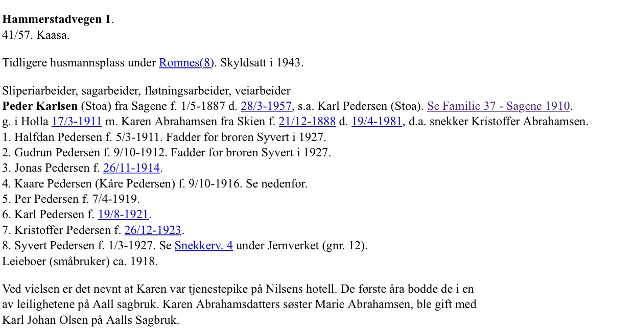 Detta er flotte kilder og jeg vil i tillegg løfte fram Geir Helge Nilsen. Uten ham hadde ikke detta blitt som det har blitt. Han har delt villig med seg av all den kunnskapen han sitter på om Sagene fra sin egen oppvekst og stoff han har tilegna seg i voksen alder. Han har som Per Bernt Tufte mange anekdoter og lokale navn som er viktig å registrere for ettertida. Geir Helge har også bidratt med skattar fra egne fotoalbum. Han har vært min veileder i et vanskelig landskap av Holla si historie. I teksten vil det komme opplysningar som står i hermetegn. Detta er ikke direkte sitat fra Geir Helge, men hans informasjon.