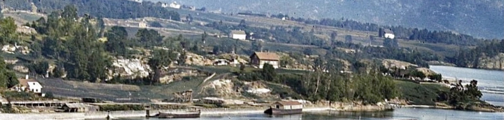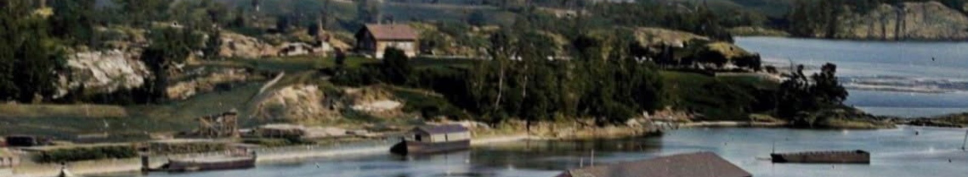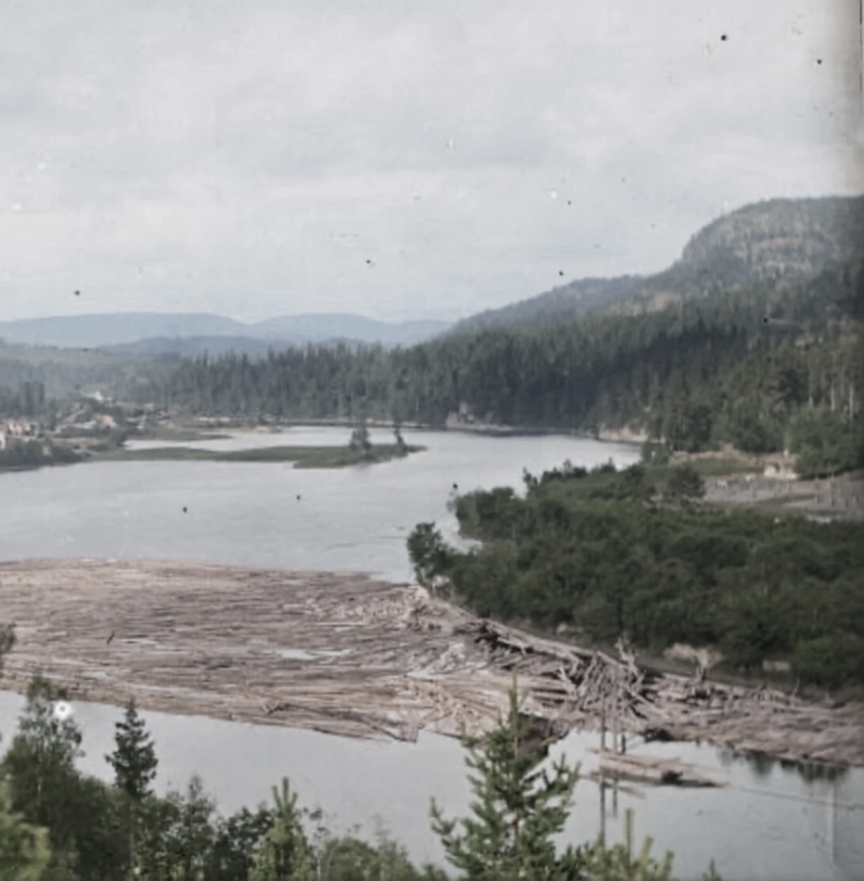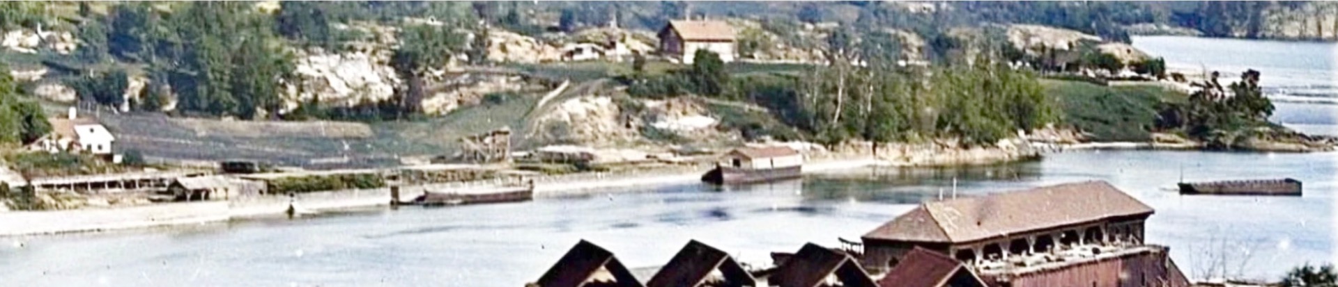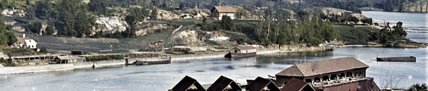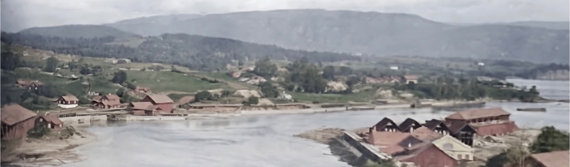 Før kanalutbygginga va vannstanden langt lågare. Her ser vi et stort fjell midt i elva som va lagringsplass for skjærte materialer.