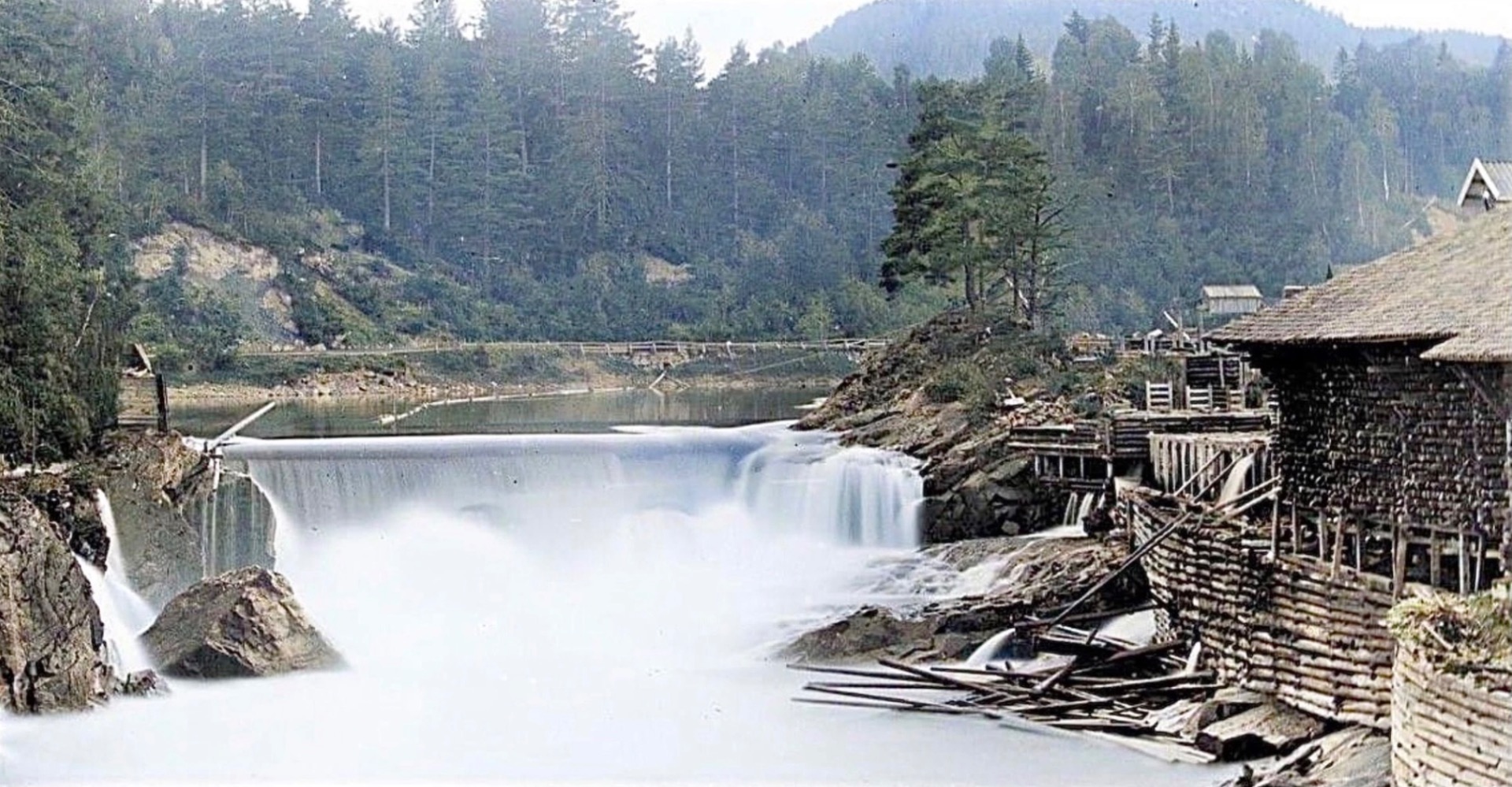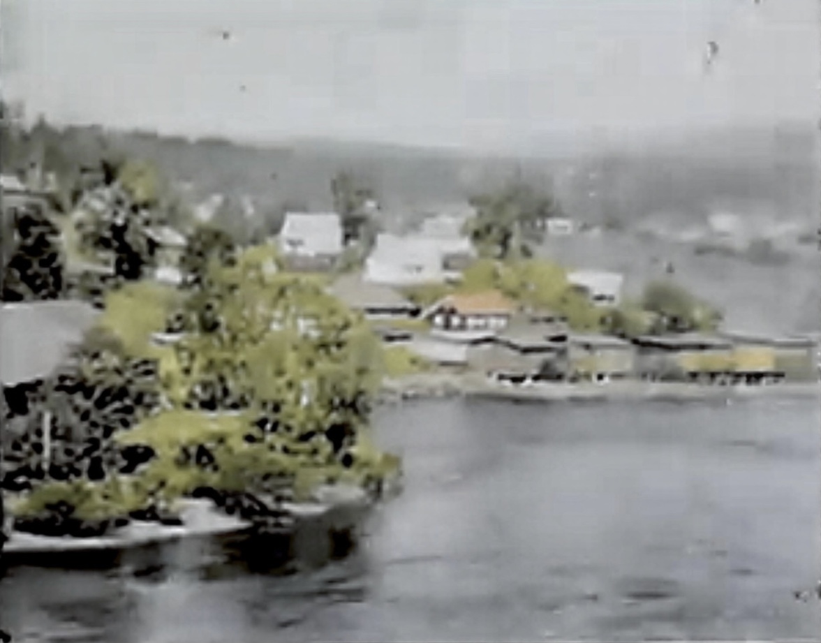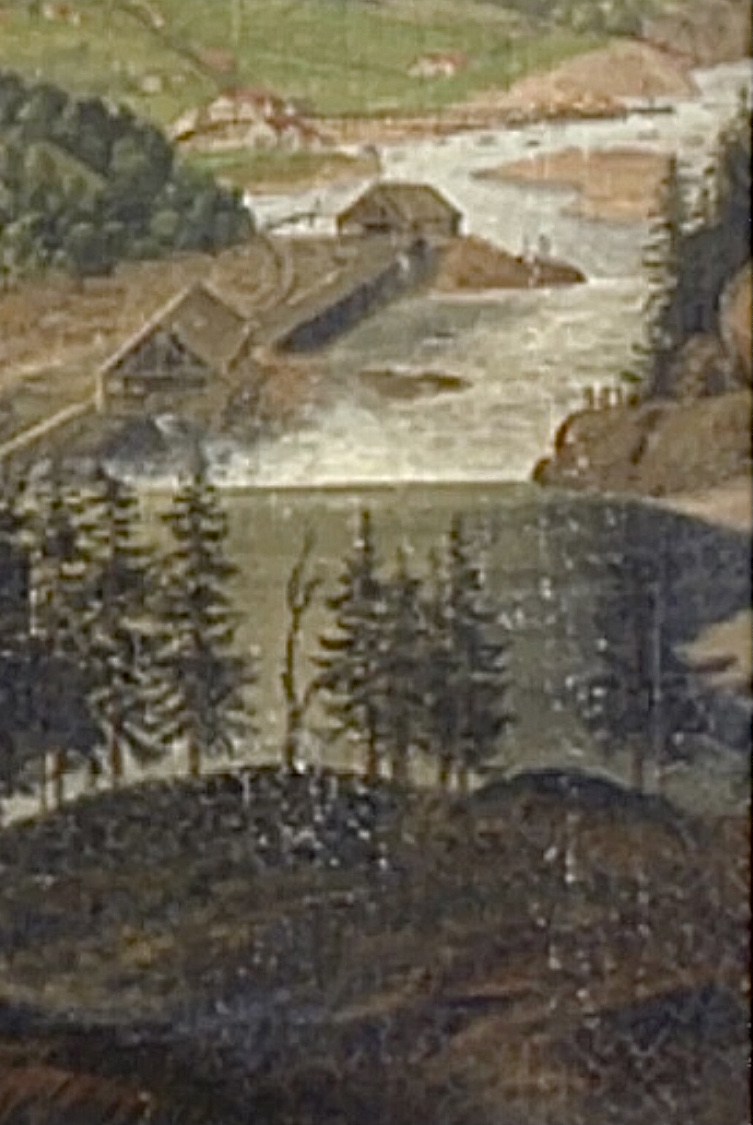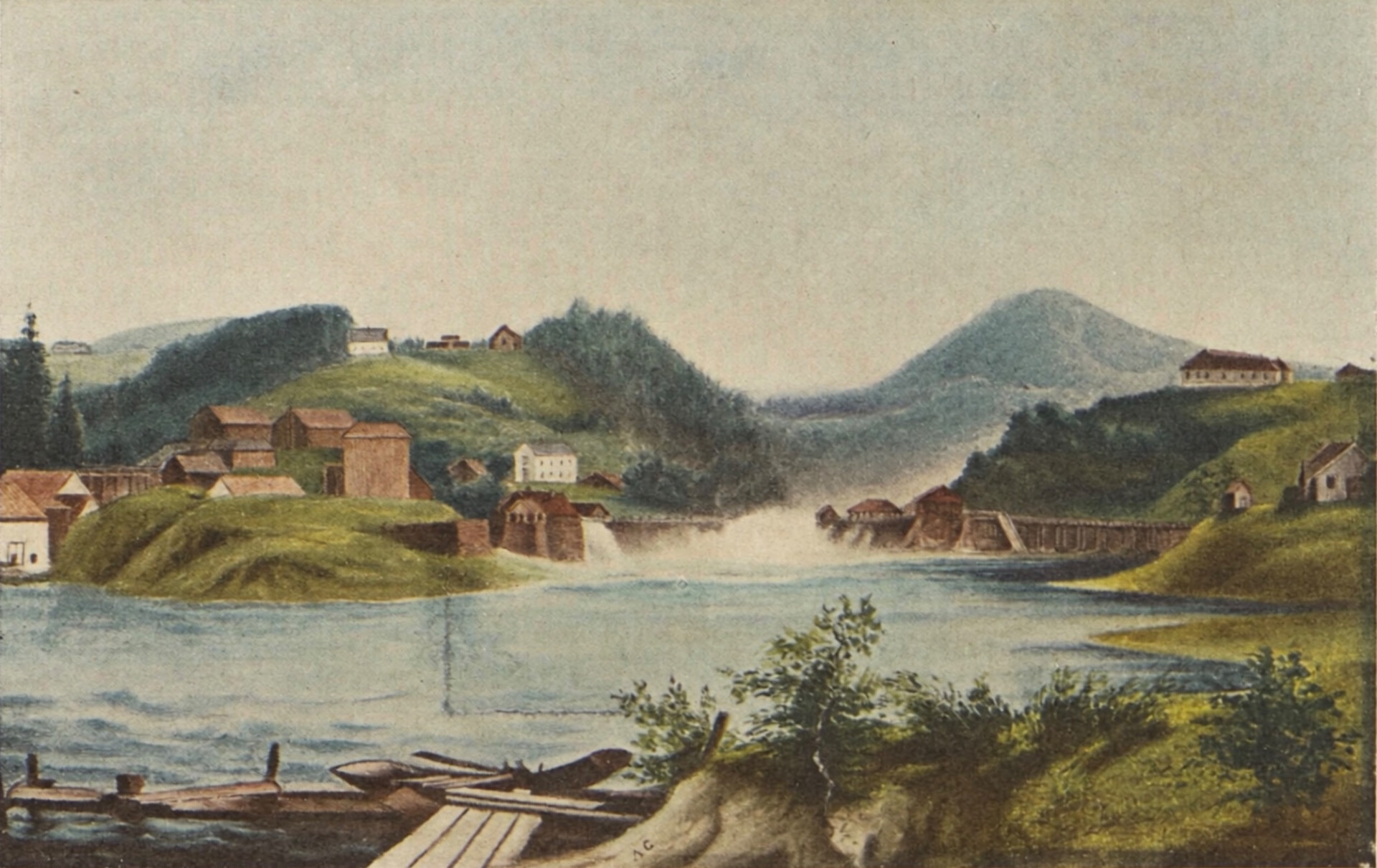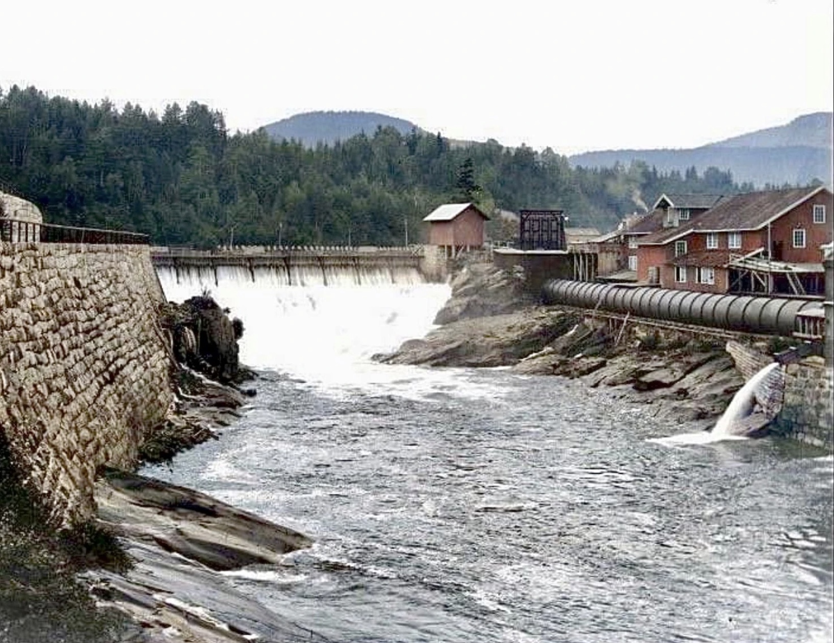 Før kanalutbygginga va vannstanden langt lågare. Her ser vi et stort fjell midt i elva som va lagringsplass for skjærte materialer.
