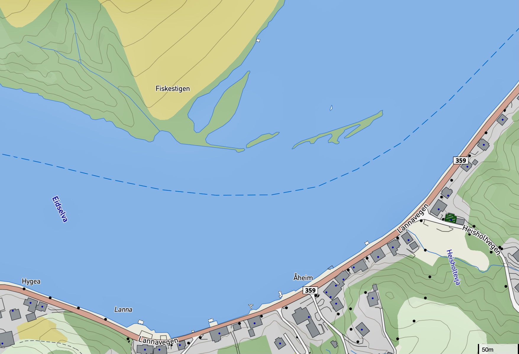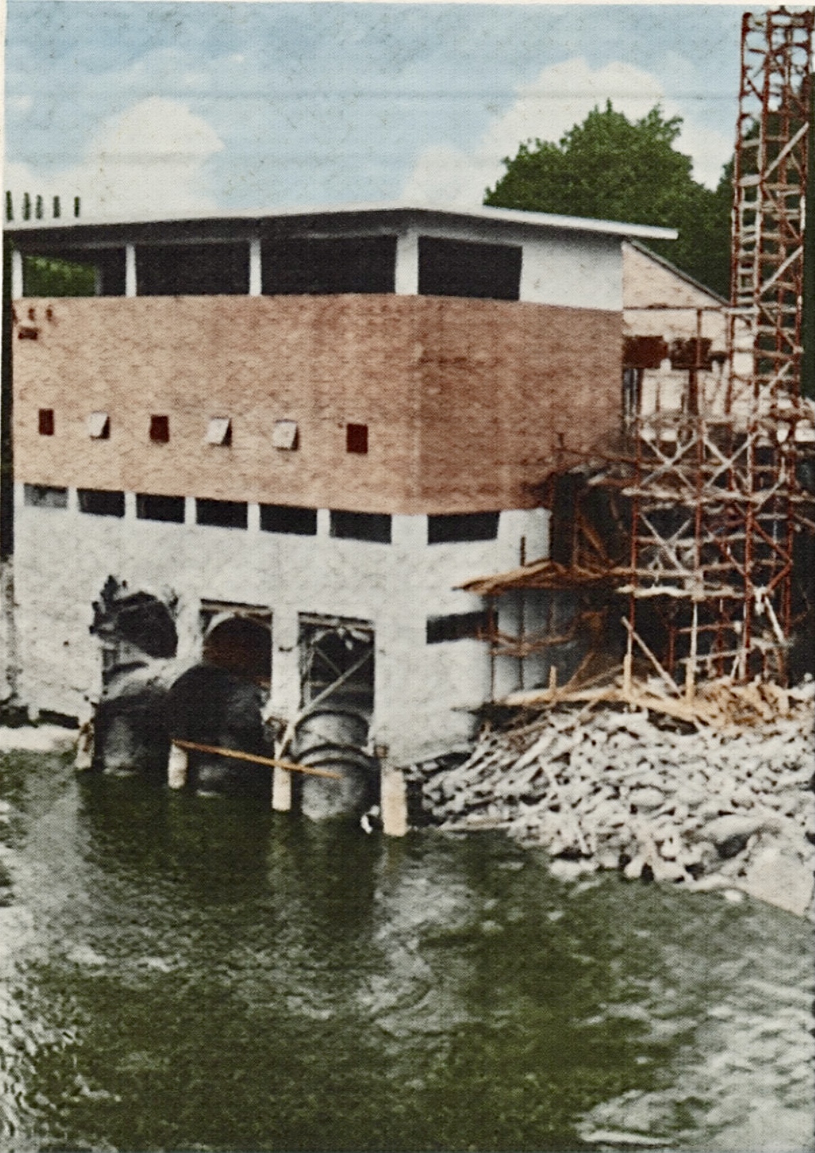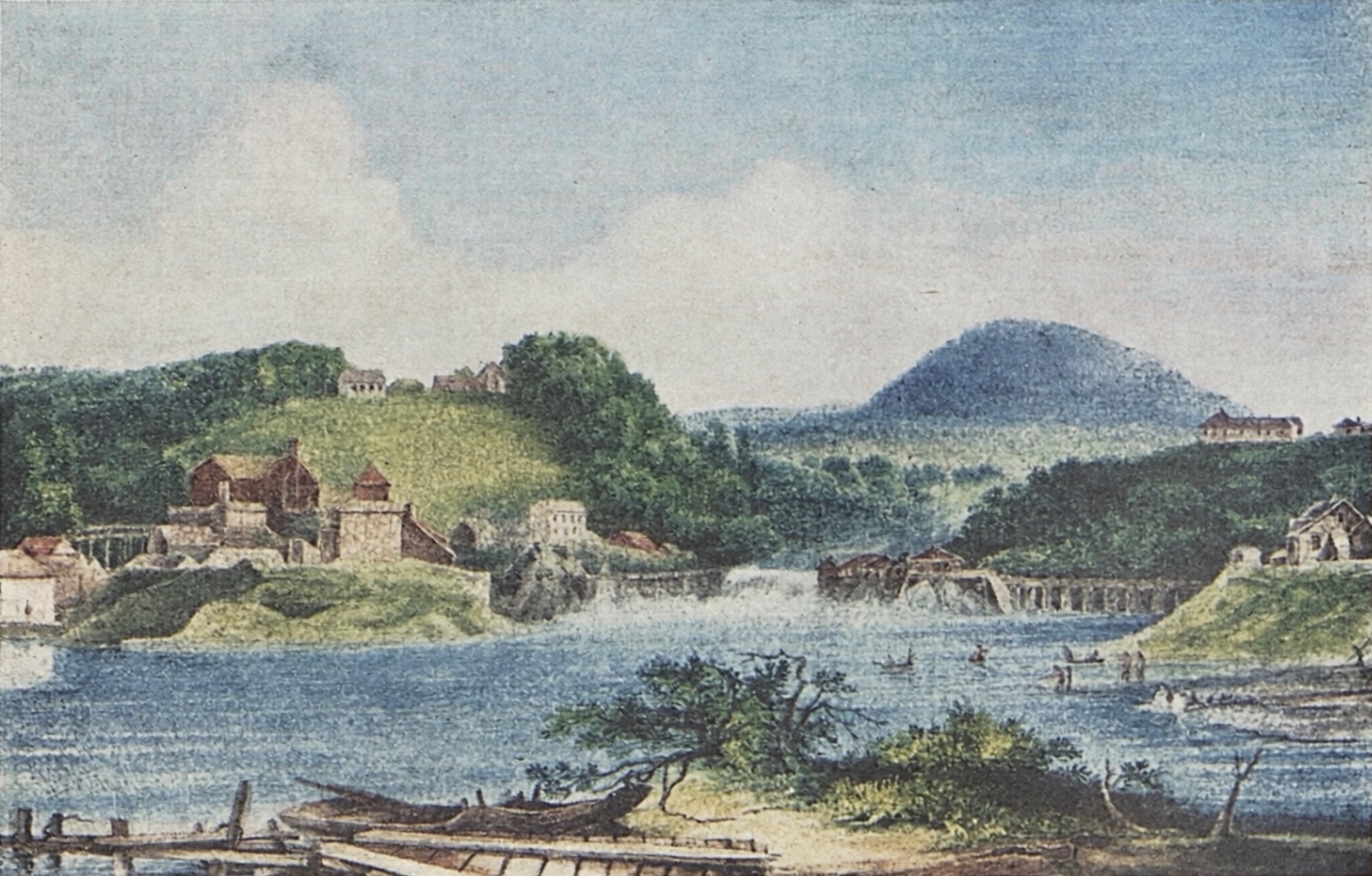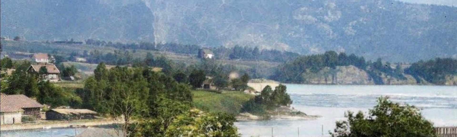Før kanalutbygginga va vannstanden langt lågare. Her ser vi et stort fjell midt i elva som va lagringsplass for skjærte materialer.
