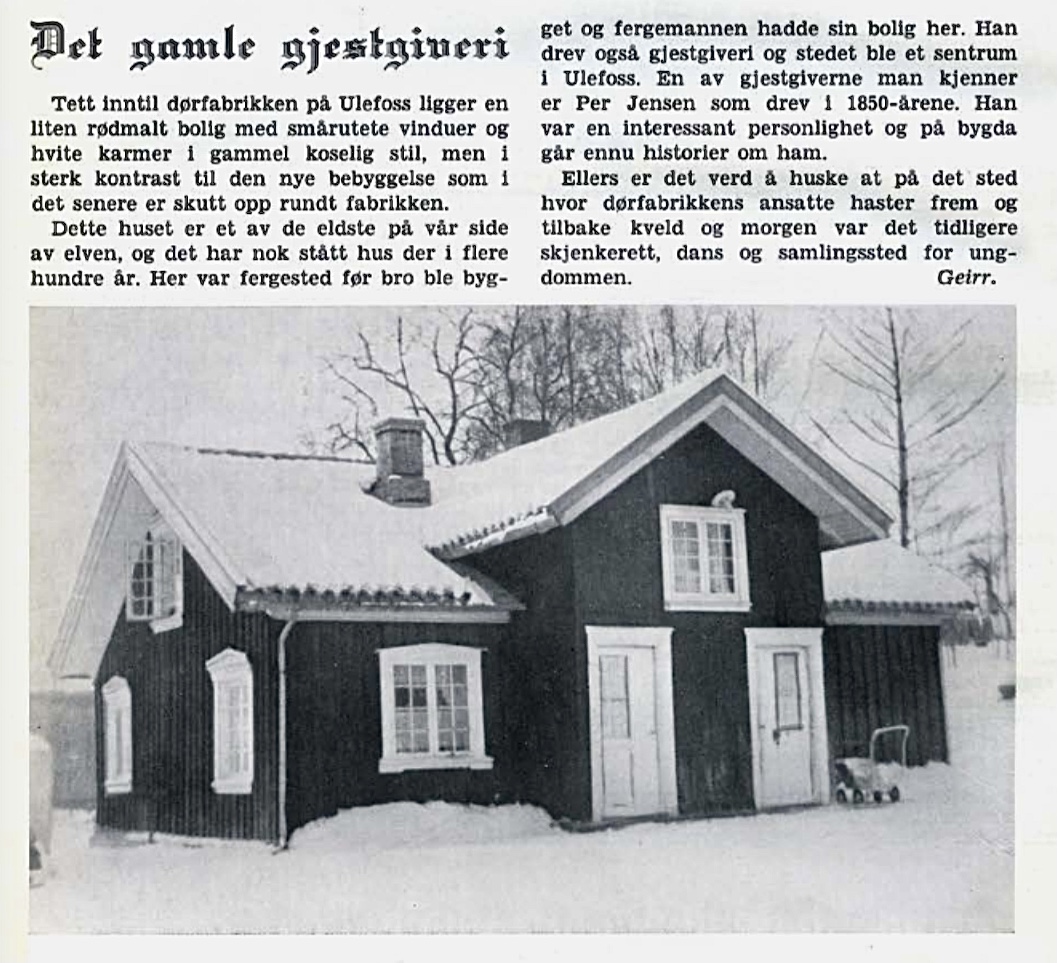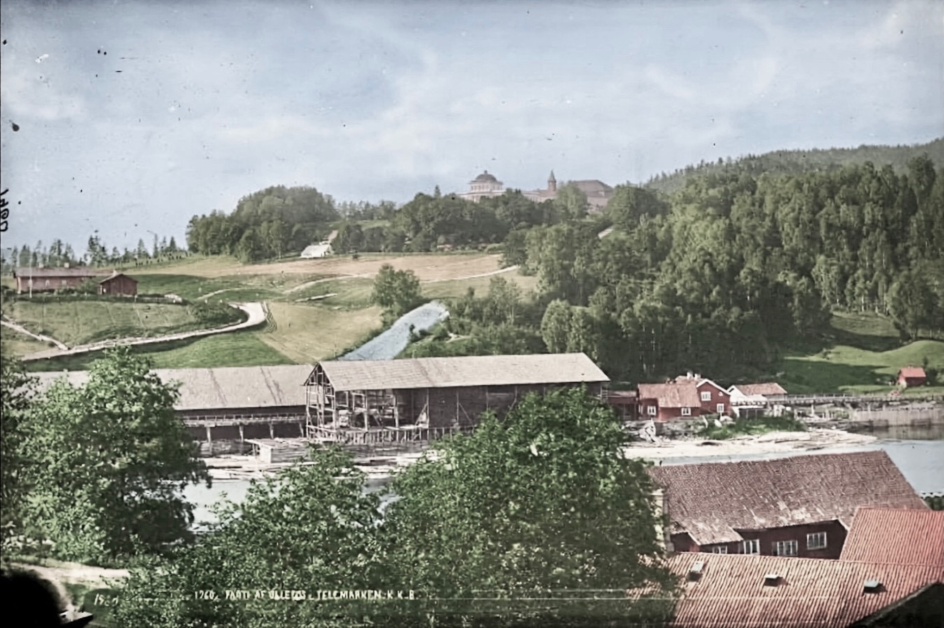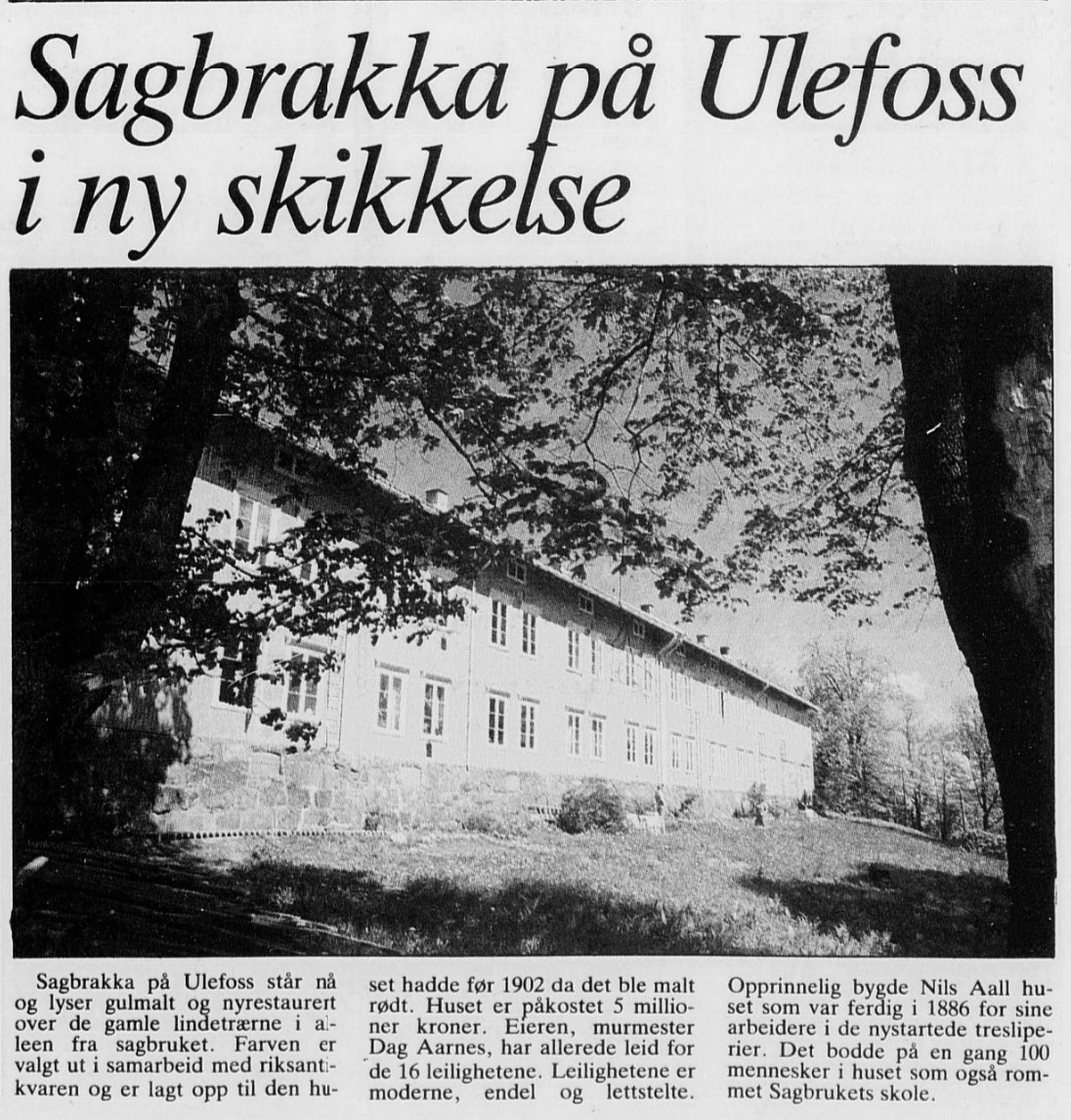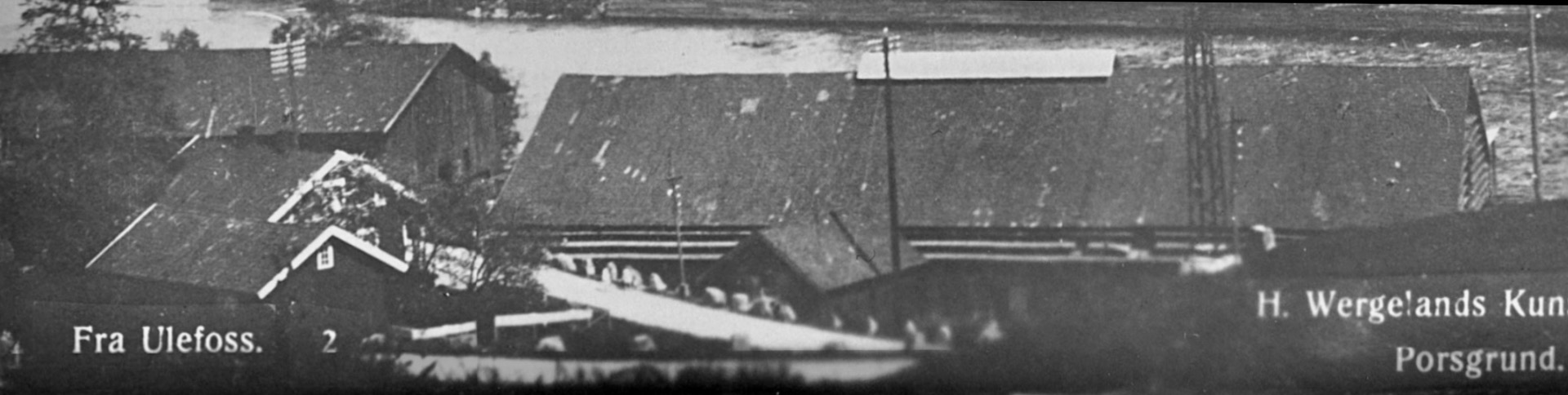 Hva slags funksjon hadde det store røde huset og hadde det et navn? Det ligger i området som skolen lå i og har heilt lik vindusinndeling. Kan taket ha brent og blitt bygd om fra valmtak te saltak? Det er da førsteutgava av skolen vi ser! I året 1804 reiv Aall ned de fire gamle sagene i ulefossen og bygde saga vi ser i fotografiet. Rett på nersida av skolen lå sagbruket og det blei ombygd og påbygd rundt 1890: