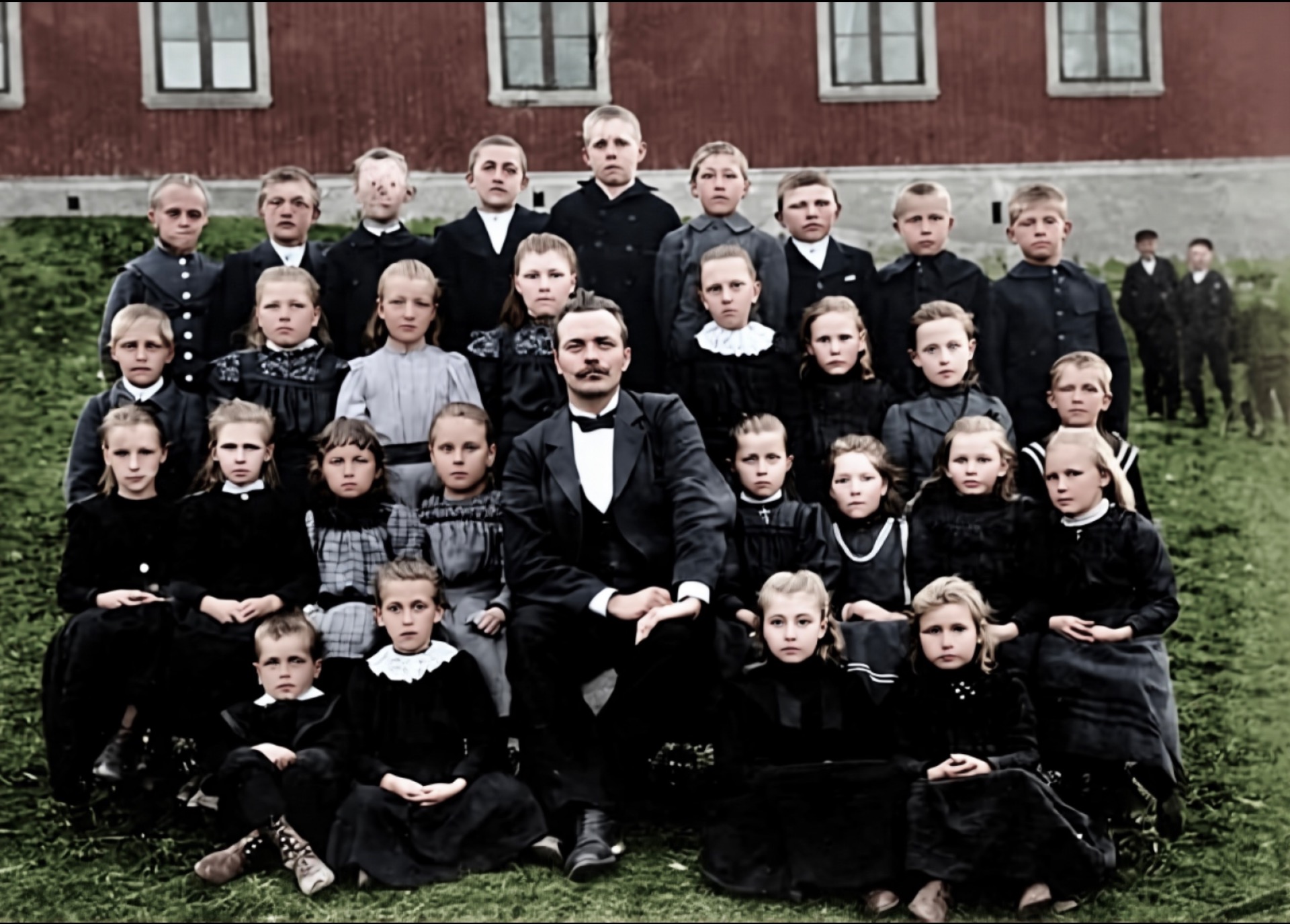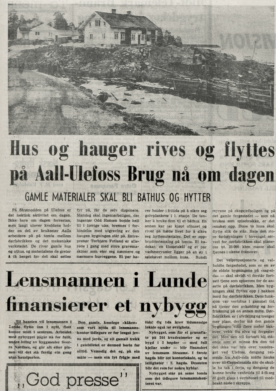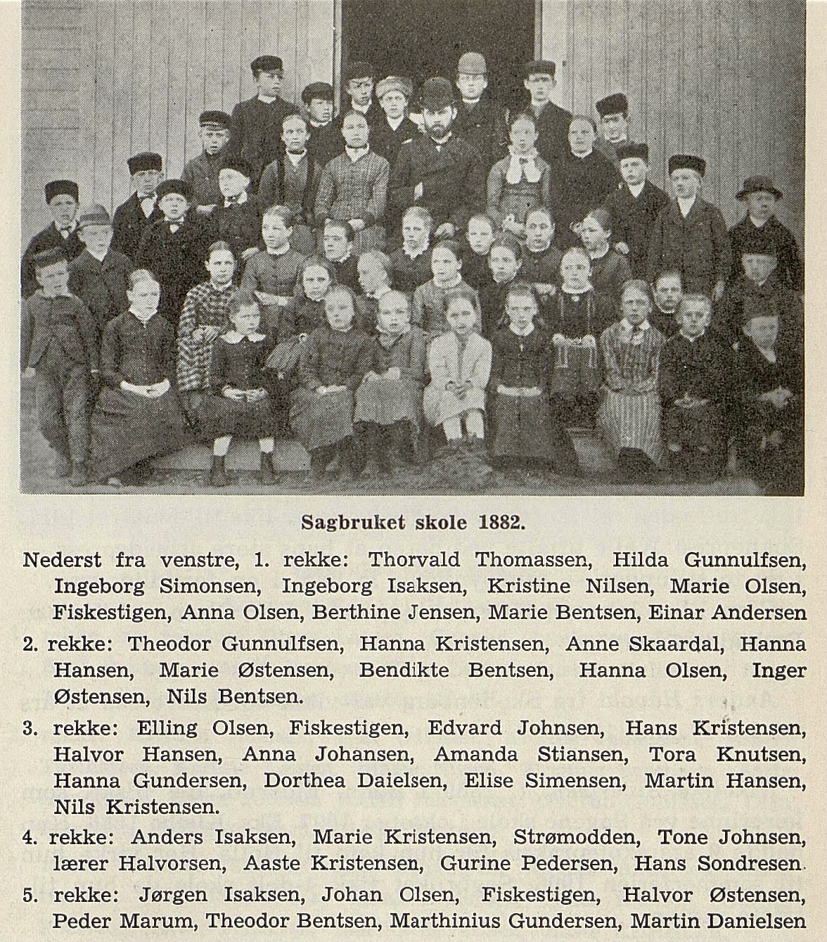 Hva slags funksjon hadde det store røde huset og hadde det et navn? Det ligger i området som skolen lå i og har heilt lik vindusinndeling. Kan taket ha brent og blitt bygd om fra valmtak te saltak? Det er da førsteutgava av skolen vi ser! I året 1804 reiv Aall ned de fire gamle sagene i ulefossen og bygde saga vi ser i fotografiet. Rett på nersida av skolen lå sagbruket og det blei ombygd og påbygd rundt 1890: