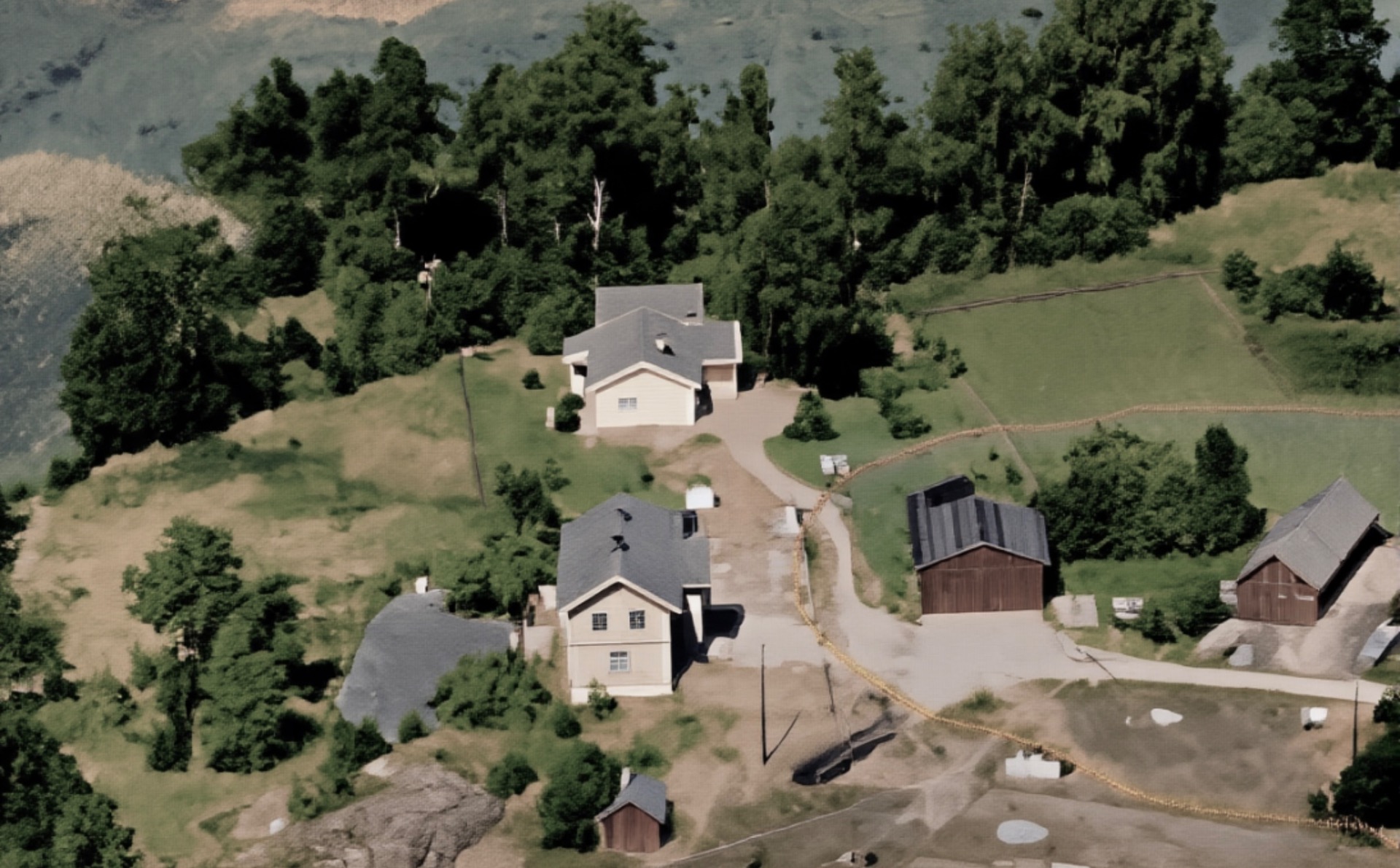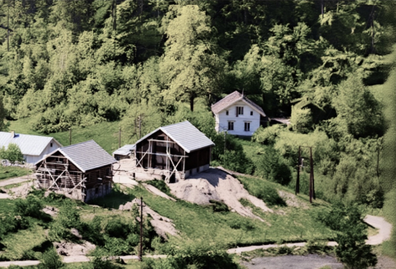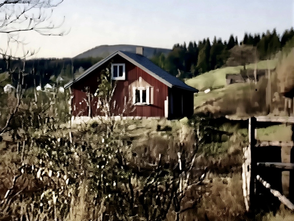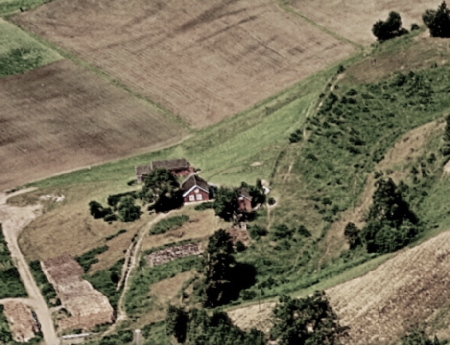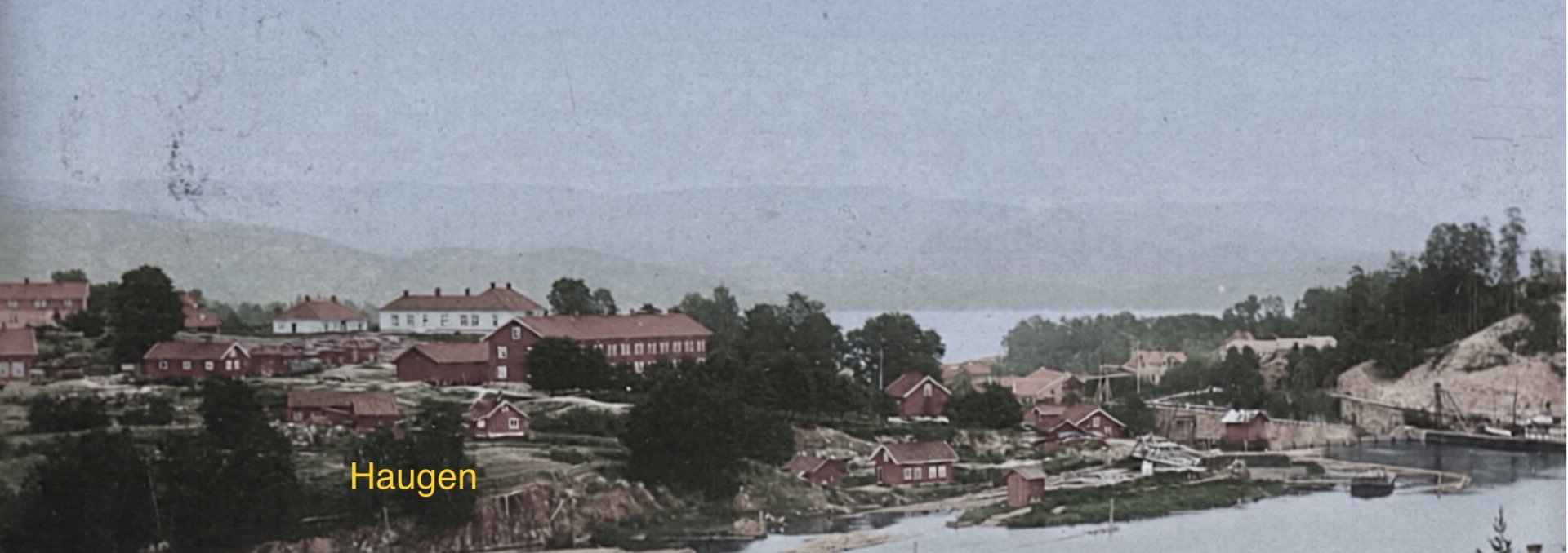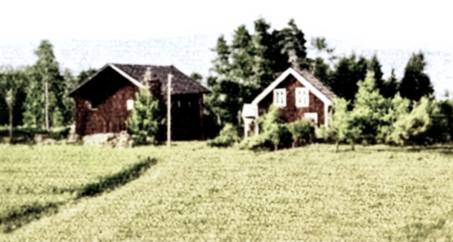 Vi ser Haugen som ei lita stue og et lite uthus kloss oppi. Siden blei det bygd nytt våningshus.