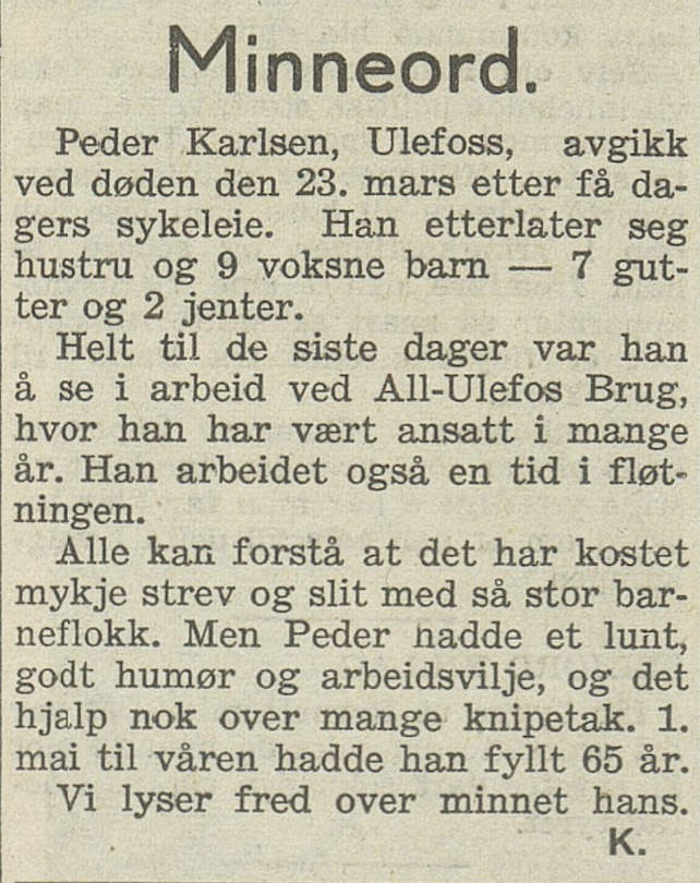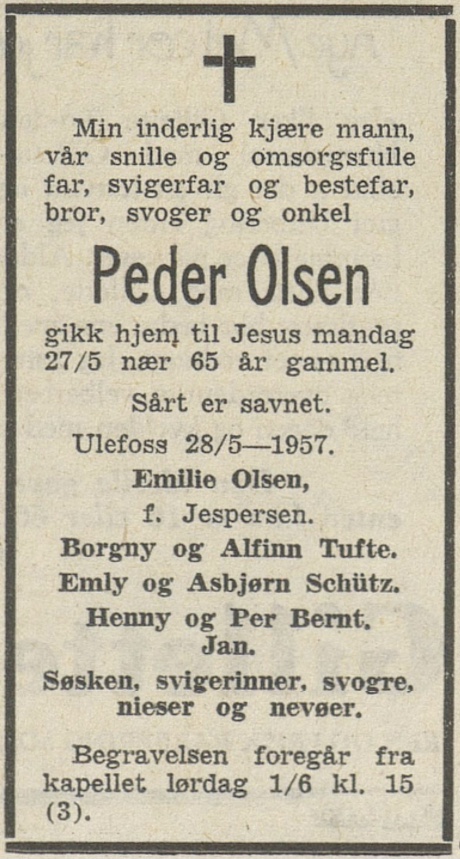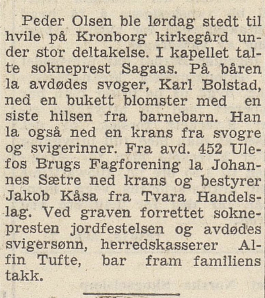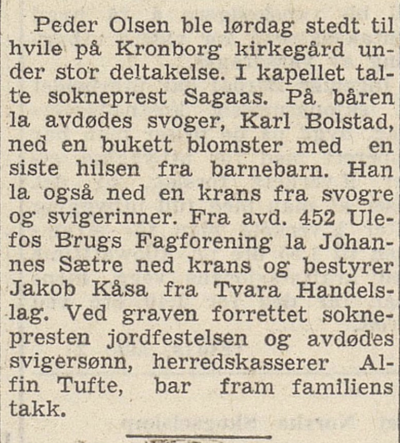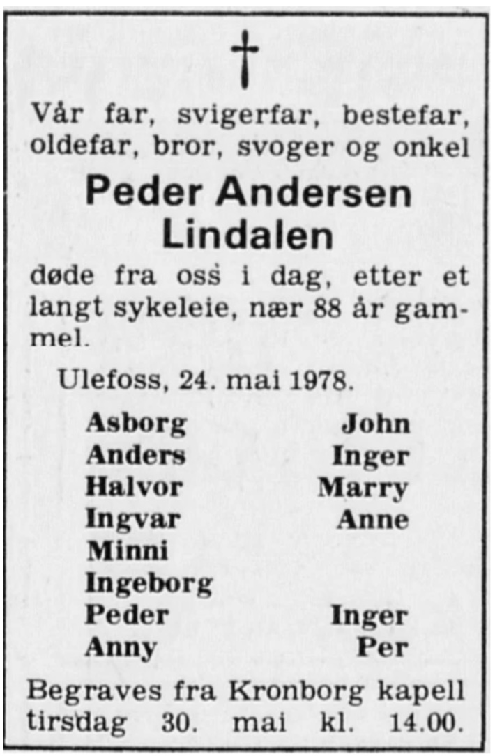 Kona te Peder hette Anne. Ho kom fra Storhaug og dør alt i 1937.