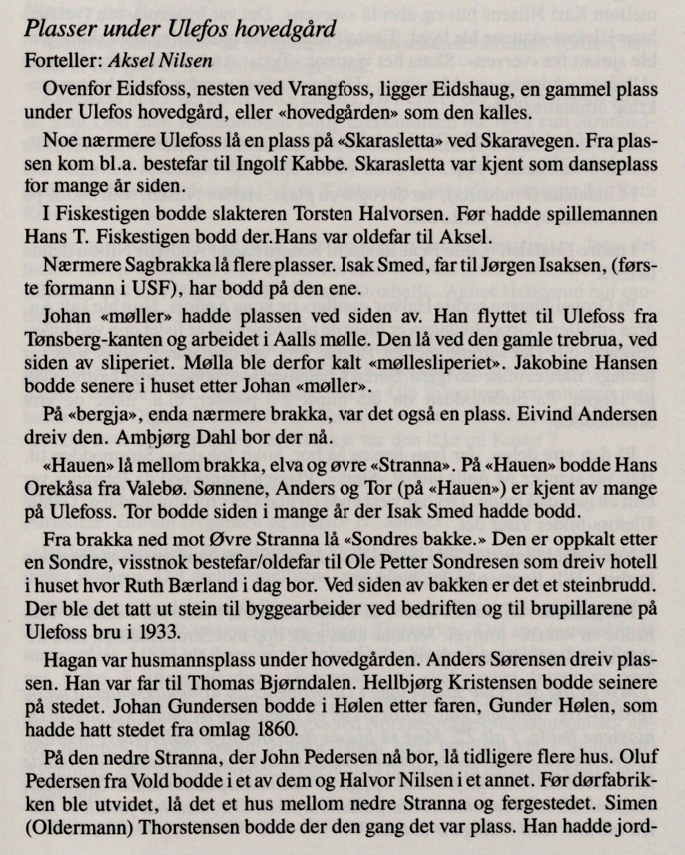 Ein gammal plass under Ulefos va Lefserud/ Levorsrud som da lå på østsida av Eidselva og som dreiv med fergetrafikk. På Lefserud skulle ein kunne betale ei lefse for å bli satt over elva…. Denna navneforklaringa ligner på navnforvirringa rundt verksplassen Pilerud som blei nevnt som Pillerud pga alle ungane! Lefserud er også ført som Levorsrud.