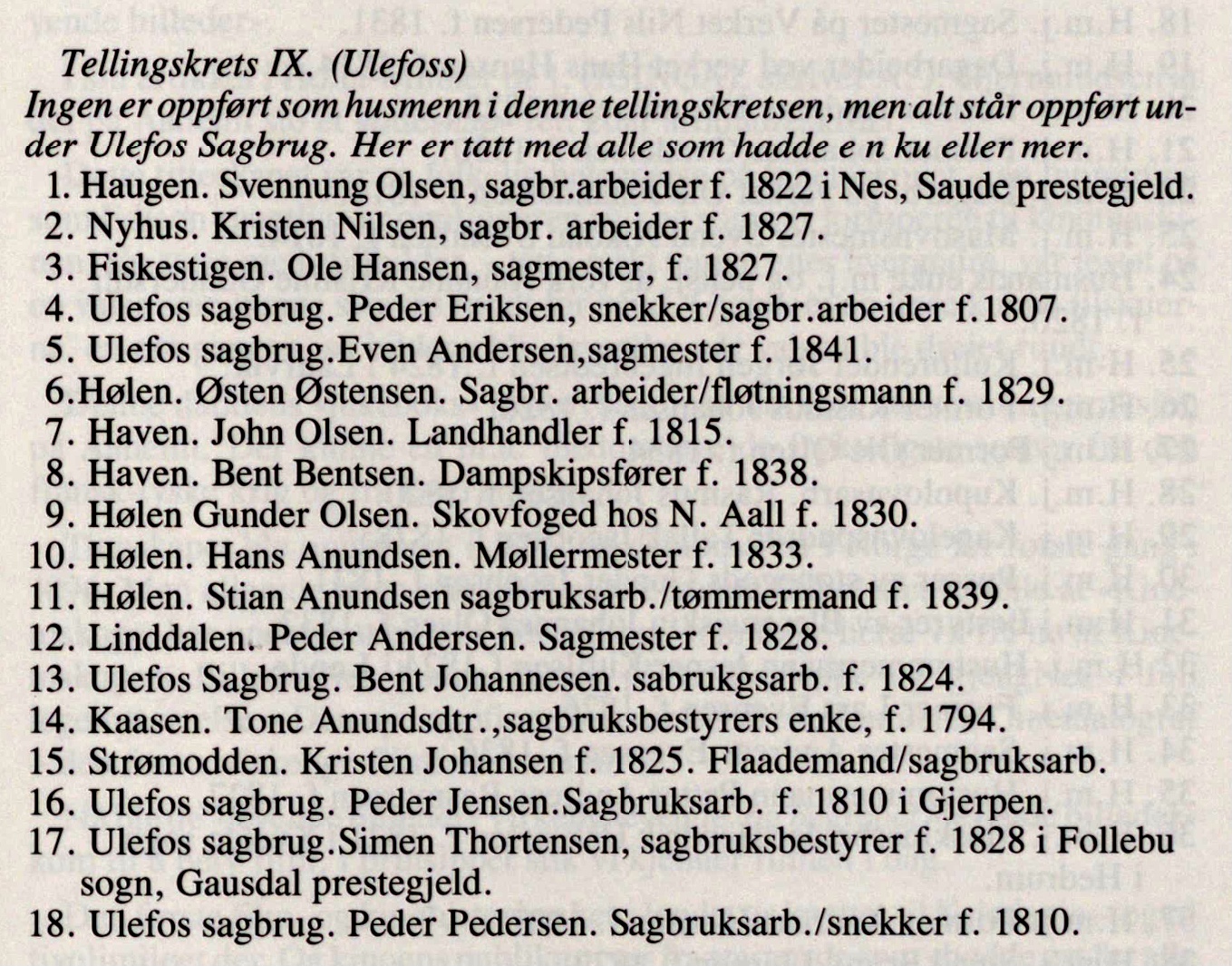 I 1665 dreiv Siver Svendsen Ulefos gård. Gården va på 4 tønner og Siver va 28 år. Under gården va Christen Friis husmann og skredder. Ein anna viktig opplysning detta året er at under vestre Heisholt er det oppført 3 sagmestere som er husmenn. Detta forteller oss at samlinga av arbeidsstokken te sagbruka ved fossen, ikke har starta. Det har med andre ord vært særs glissen bebyggelse på Sagene i denne tida.