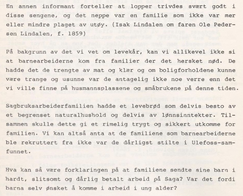 For året 1835 gjelder disse talla: Sagbruket hadde 116 ansatte, der 58 mennesker budde i barakken(den hvite slaggsteinsbygningen). Dissa 58 va fordelt på 16 familiar. Da har 58 individer teknytta sagbruket budd i ulike hus borte på Sagene. Så har det i tillegg vært hus te gårdsfolka osv. Dissa va 38 tesammen. Det va i alt 27 plassar, der de fleste va meget små. Legger vi sammen 58 med 38, får vi 96. Det har da budd 3,5 mennesker i snitt i hvert hus.