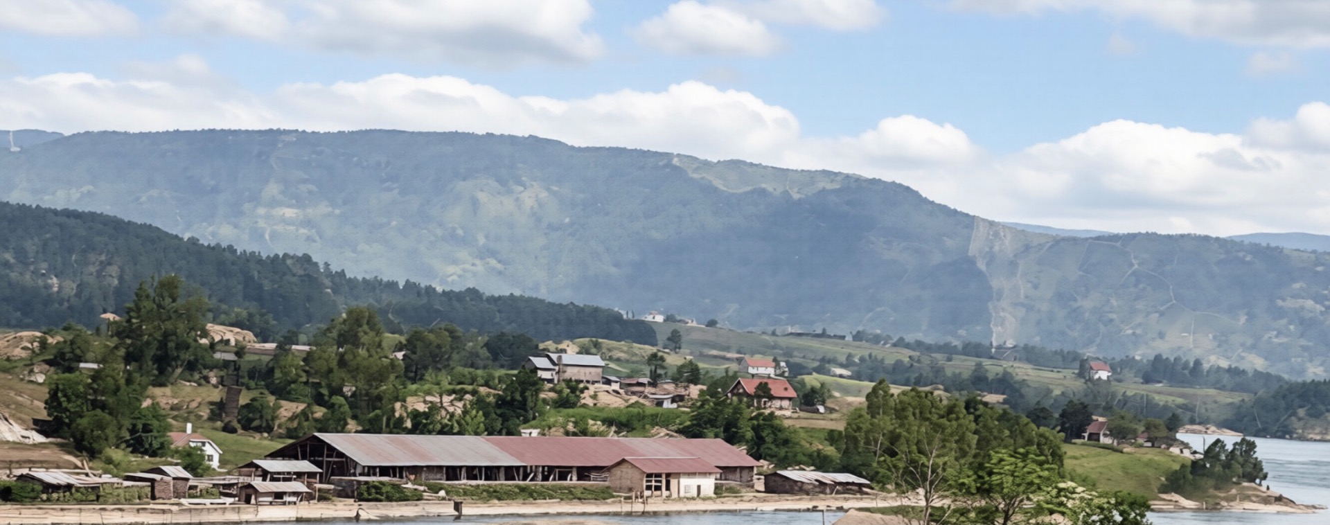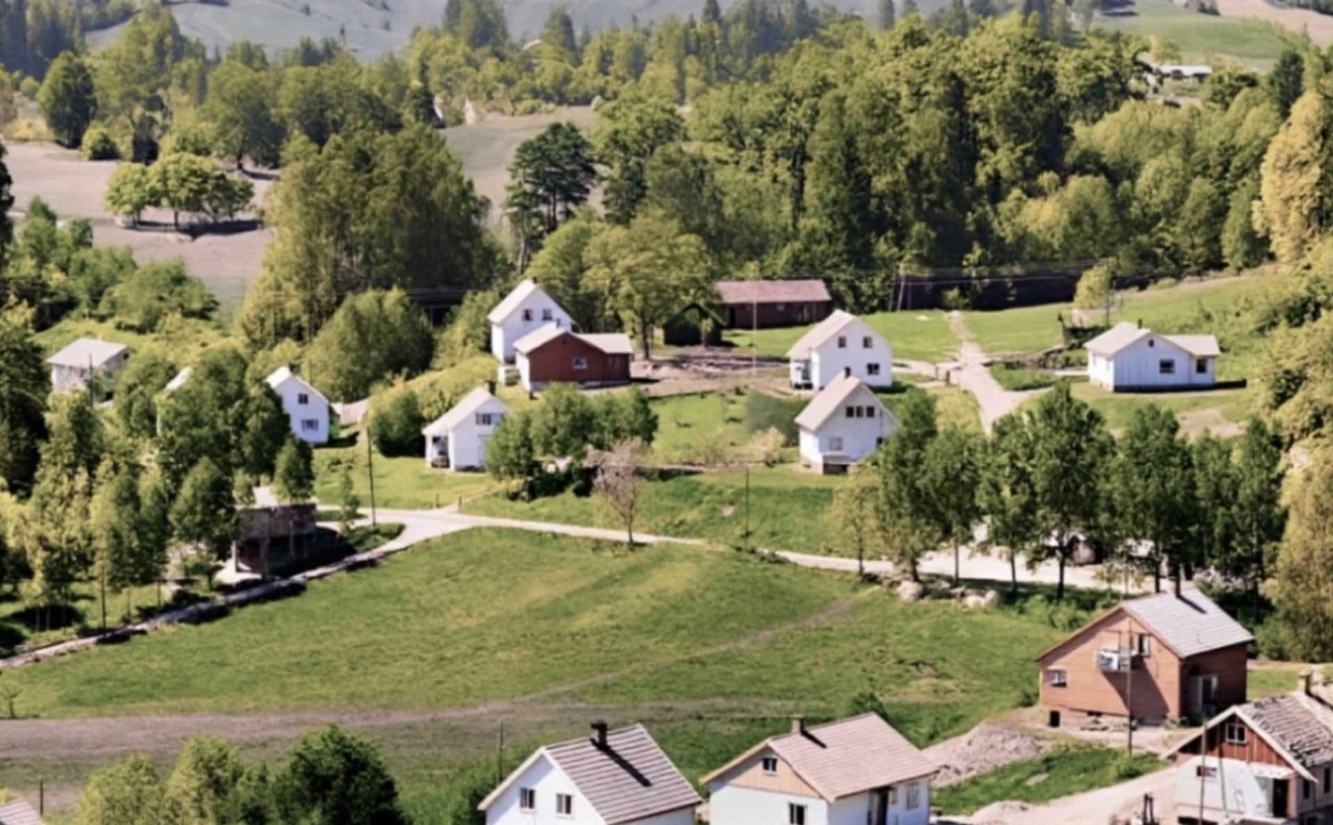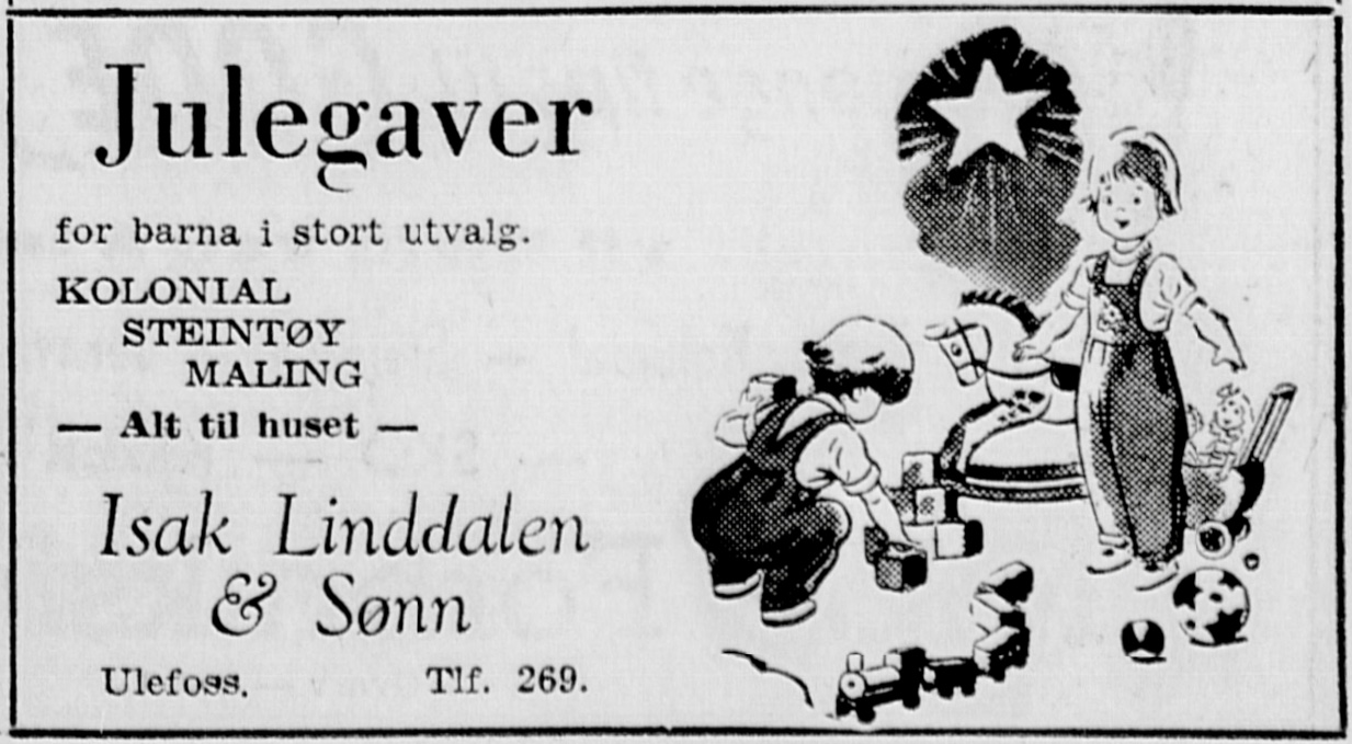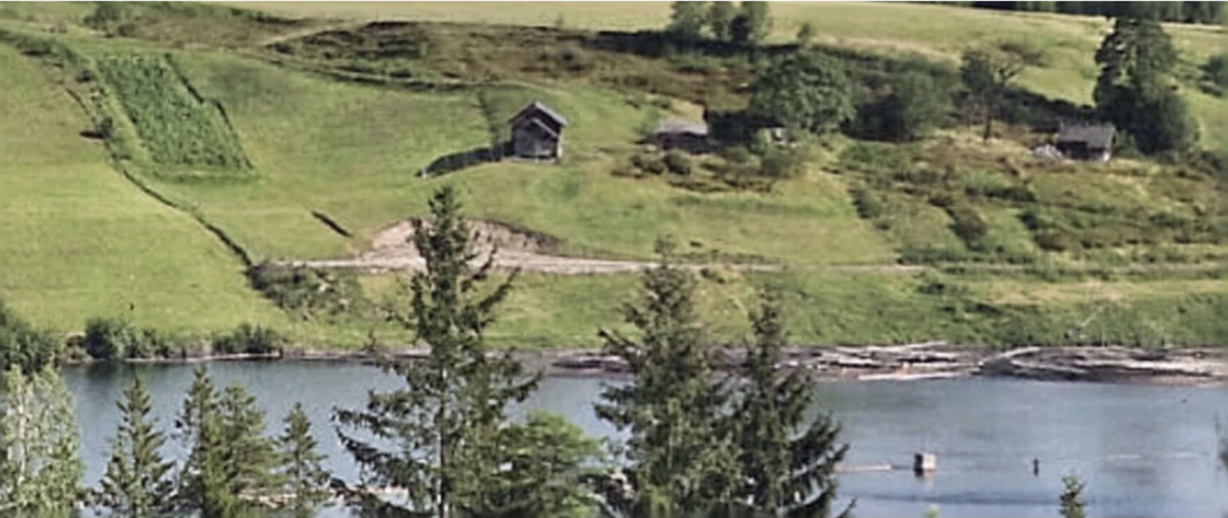 Her ser vi butikken te Isak nærmast og Lindalen med sine enger bakerst.