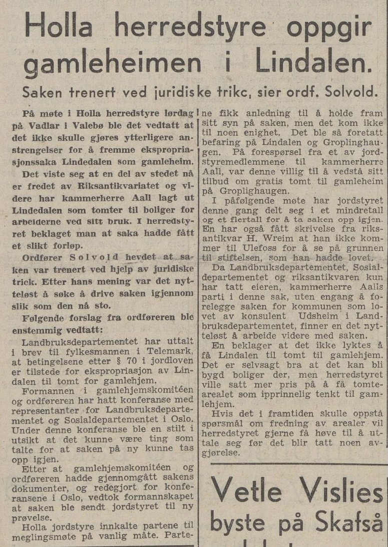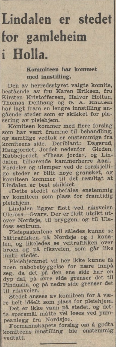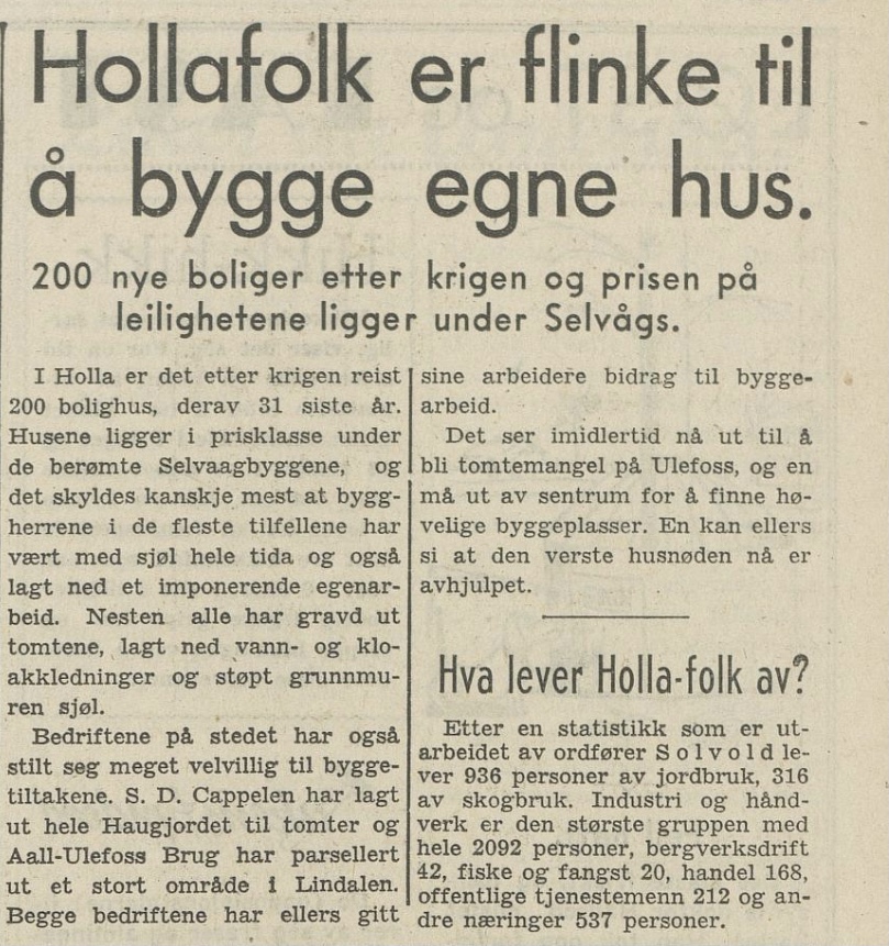 Byggmester Halvor Lindalen bygde Holla Kristelige Ungdom sitt hus. Det må væra Fredheim eller dagens Røde Kors hus. Siden bygde han Frelsesarméen sitt hus på Lanna. Halvor hadde ansvaret for at Holla Herredshus skulle stå ferdig 1. april 1935. I september 1956 er Halvor og sønner hovedentrepenørar da spaden går i jorda på Dagsrud.