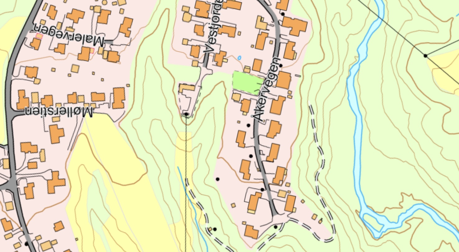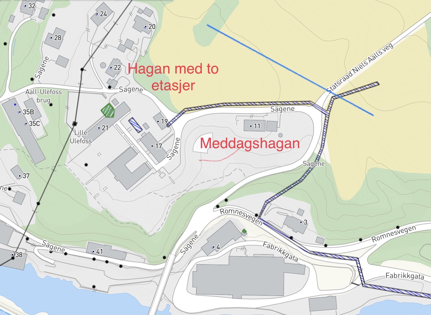 Blå: Hagan med de to etasjene. Gul strek: Sondres bakke etter møllarsønnen Sondre Hansen 1805-1891. Sondre og kona hadde mange ungar. Ole Petter va ein av døm og han va tjenar i Holden for Cappelen- familien og siden hotellvert på Sondresen’s nede ved dampskipsbrygga.