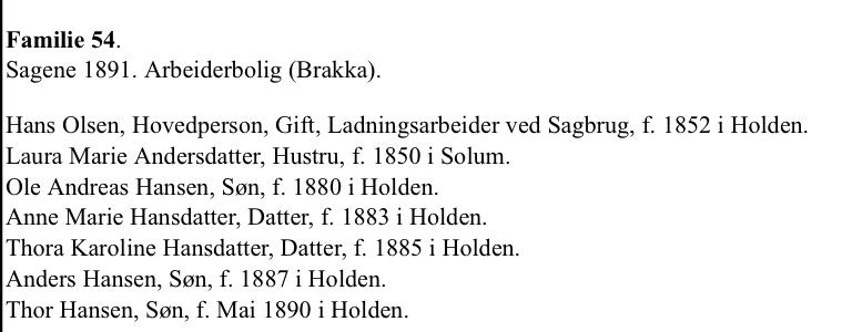 Hans Olsen Orekåsa(1851-1927) kom fra Slettekås oppe på Hammerstad. I 1880 blir han gift med Laura Marie (1856-1928) Moen fra Kilebygda. Paret hadde dissa ungane: