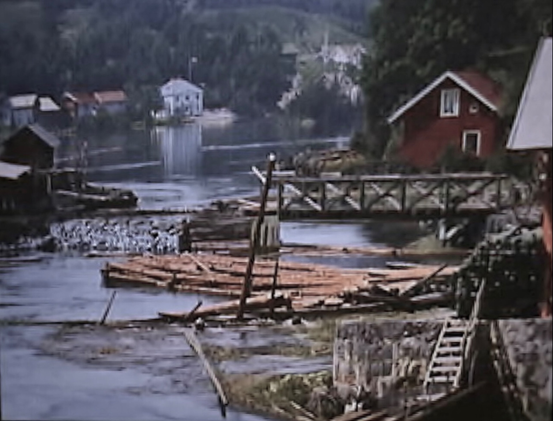 Her ser vi sagstokken blir slusa inn på veien mot sagbruket: