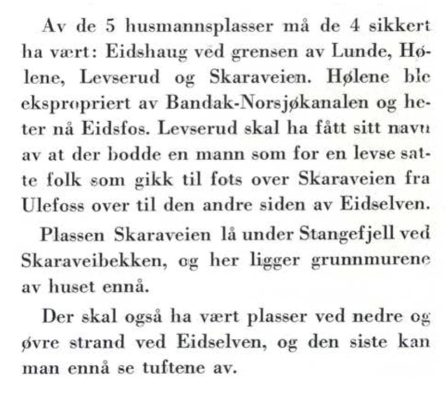 Ved veien som går fra Hovedgården te Eidsfoss, har det liggi ein liten plass som hette Skaraveien/ Skarasletta eller muligens Nyhus. Før dagens nye vei blei bygd, skulle ein kunne se grunnmuren på denna plassen. Navnet er knytta til det norrøne ordet skor ellerskara, som refererer til en sprekk, en kløft i et fjell eller en avsats.