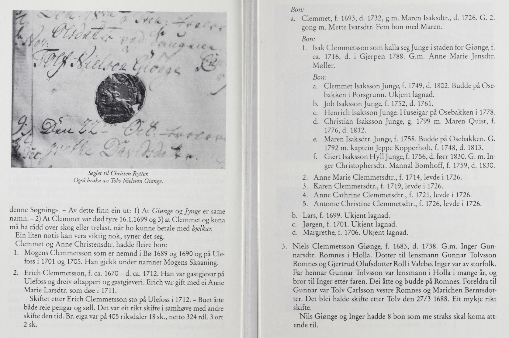 Clemmet dør på 17.mai 1860. Kone nr to, Maren Nilsdatter, dør 13 månader før på Haugen under Ulefos. Clemmet hadde ei datter fra første ekteskapet. Inger Clemmetsdatter va gift med Nils Rasmussen som va flåtemann. Disse har også trulig budd på Haugen. Inger dør i juni 59 av tæring og to år før bukkar Nils under for kolera.