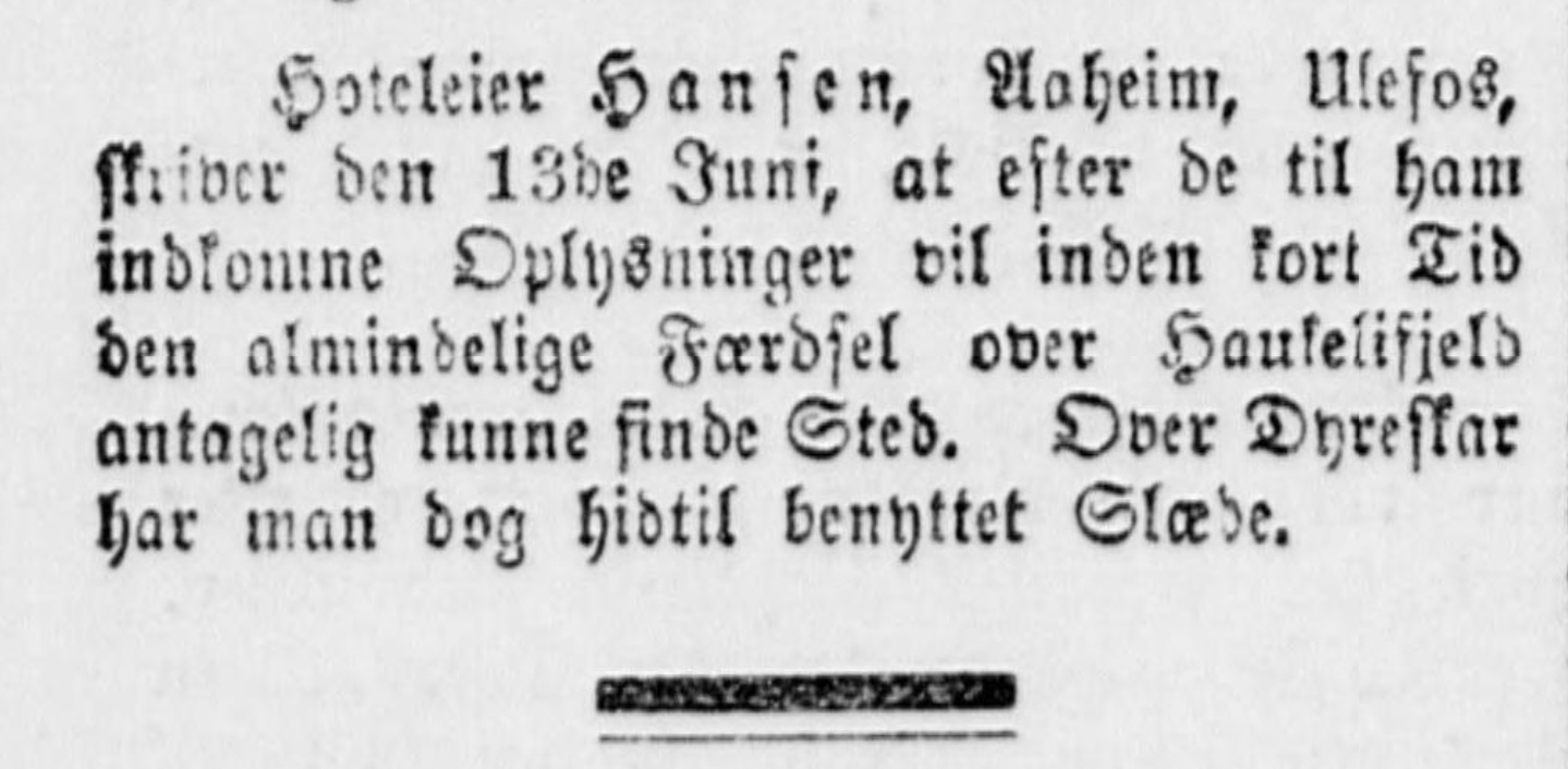 Hotelleiaren hadde fått nyss om at alminnelig ferdsel over Haukelifjell va snart i gang. Over Dyreskar måtte slede brukas.