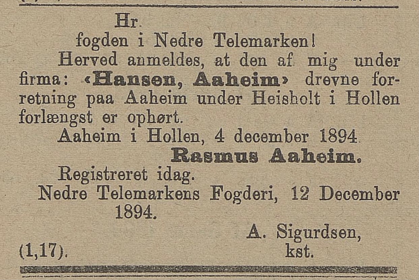 Det er mange avisnotiser med Aaheim i denna tida. Jeg plukker ut noen og «kopierer» teksten fra de andre: