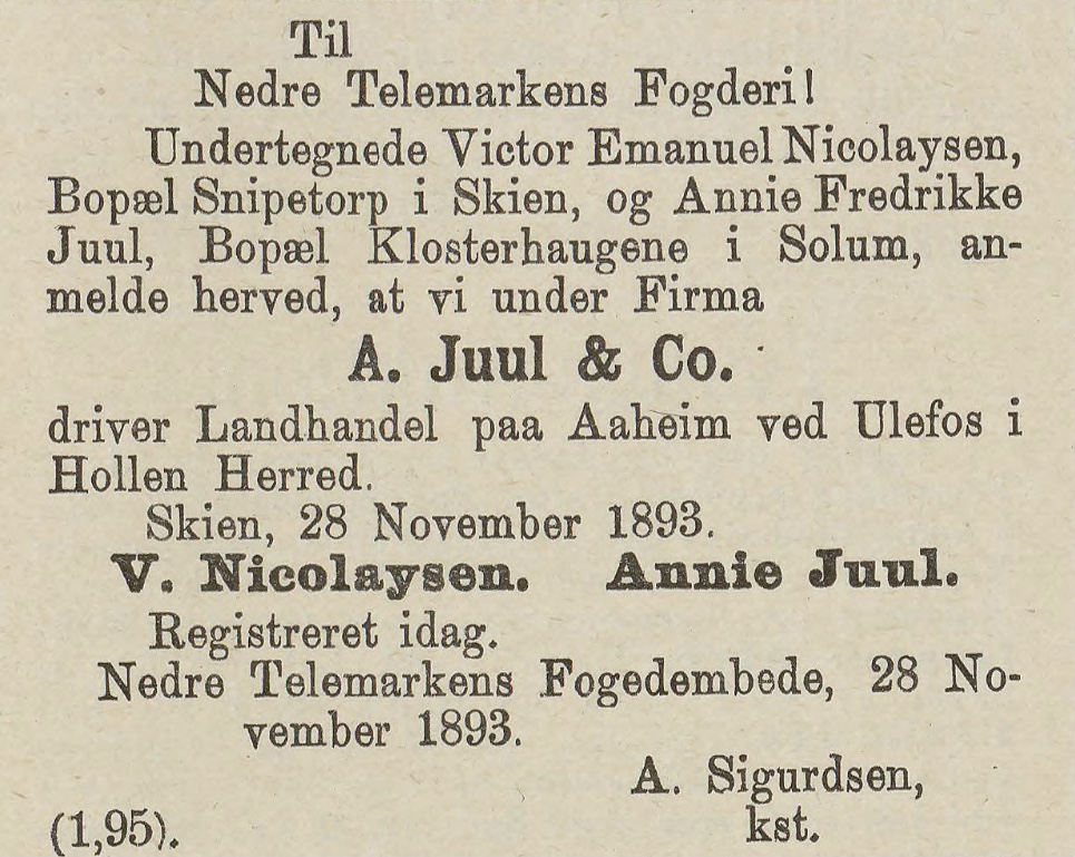 Victor blei født i Drammen i 1860 og kona Anne i 1870 i Skien. Oppholdet på Ulefoss kan ikke ha vært langvarig. Sønnen Thorleif blir født i Skien i 1896 og søstera Lydia to år etter. I 1900 er han kjøpmann og driver manufaktorforretning i Skien. Familien bur i Snipetorpgate.