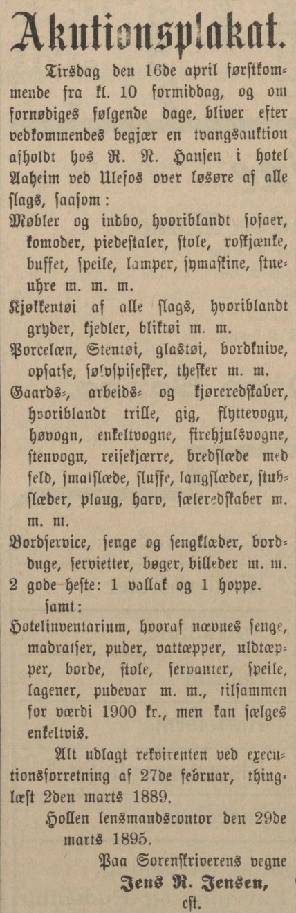 Hotell Aaheim ska gå på auksjon i april 1897.