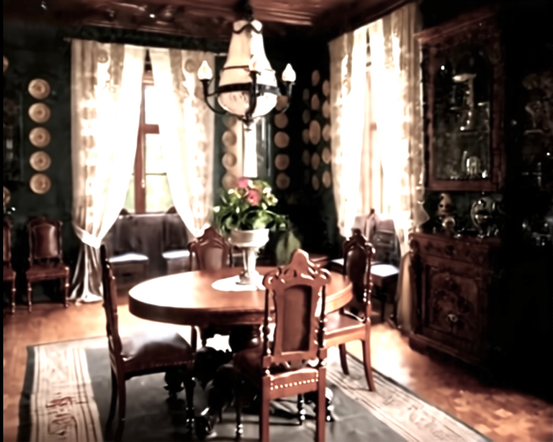 I den eine enden av huset lå spisestua. Her va det blant mange ting gardiner, blomsterpotter og ein kanarifugl. Ute va det store lønnetre og ein stor mur. Rundt i hagan gjekk det gangar av sand.
