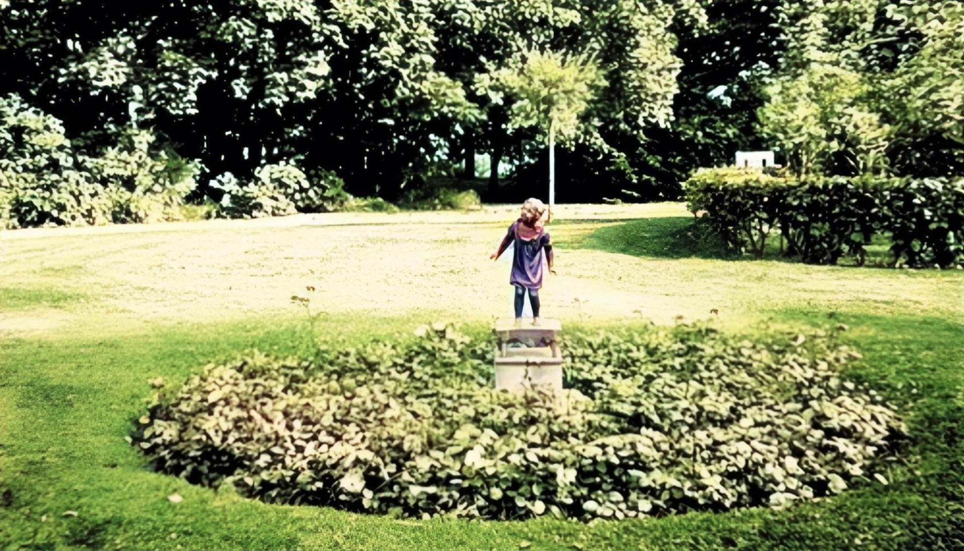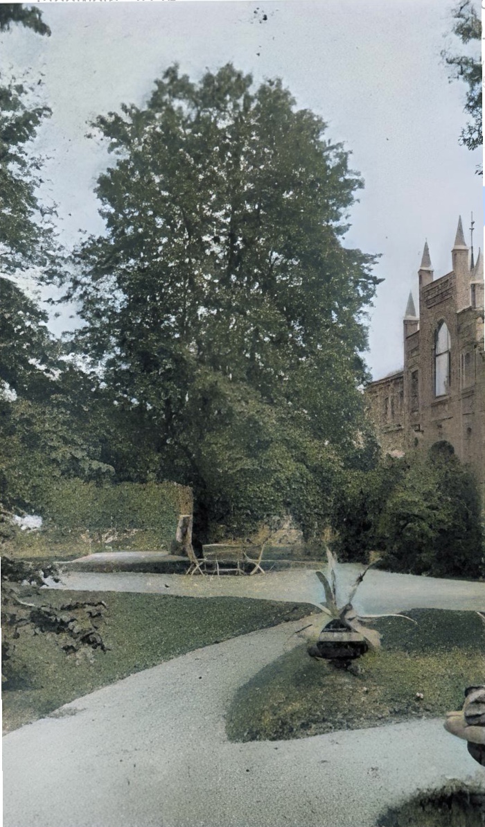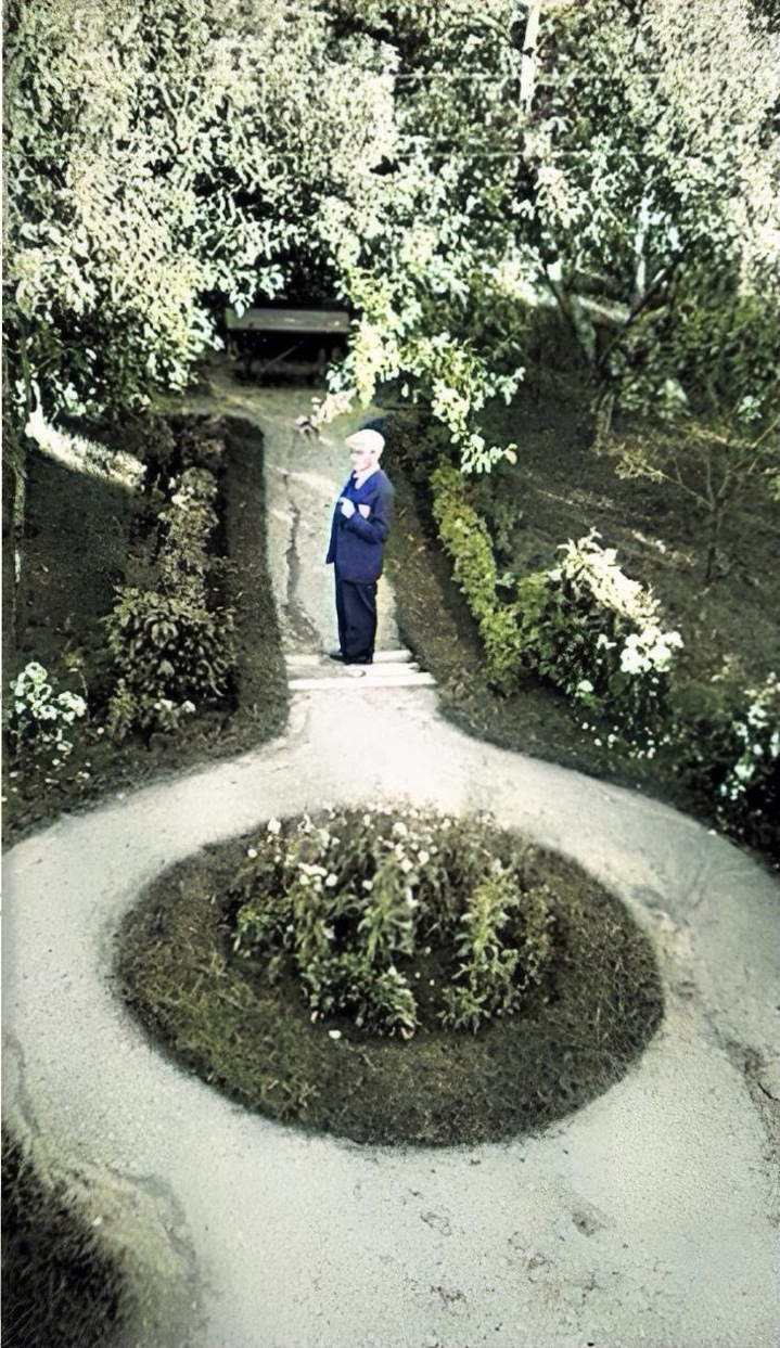 Et fotografi fra rundt 1890?: Her er det frodighet og symmetri som gjelder. Å holde detta hageanlegget i hevd har vært ein fultidsjobb. Sandgangane skulle lukas, busker og planter måtte vannas og trimmas og plenen måtte holdas kort. Da dette va gjort, va det bare å starte på ein ny runde. Da høsten kom, måtte alt lauvet bort. Detta va før lauvblåsere og robotkløppere!
