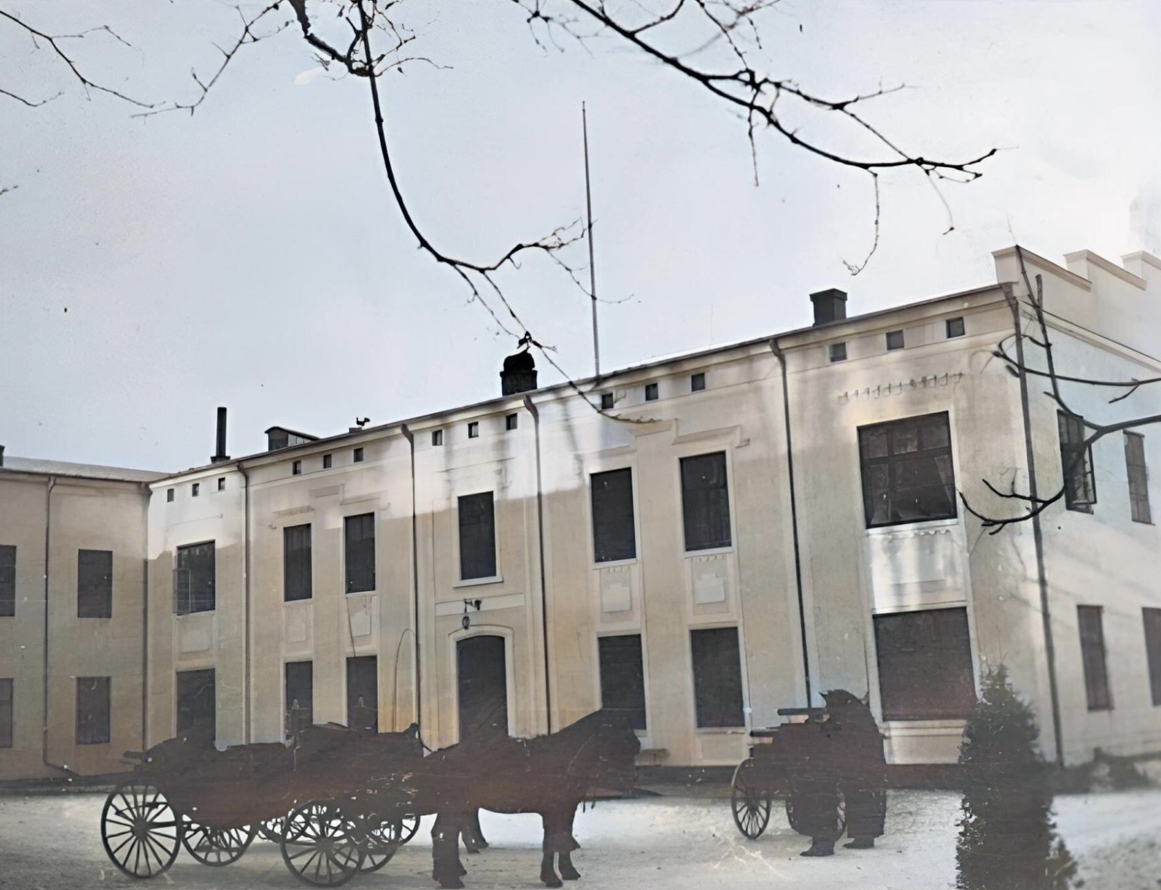 Trulig det eldste bildet vi har i denna serien. I eldre bøkar blir området kalla Borggården. I veggen sitter det ei dame i kjole og holder på med sitt, mens de to bikkjene følger med. Detta bygget stod ferdig i 1858 og ein av fløyene « spiste opp» bygget som stod her før.