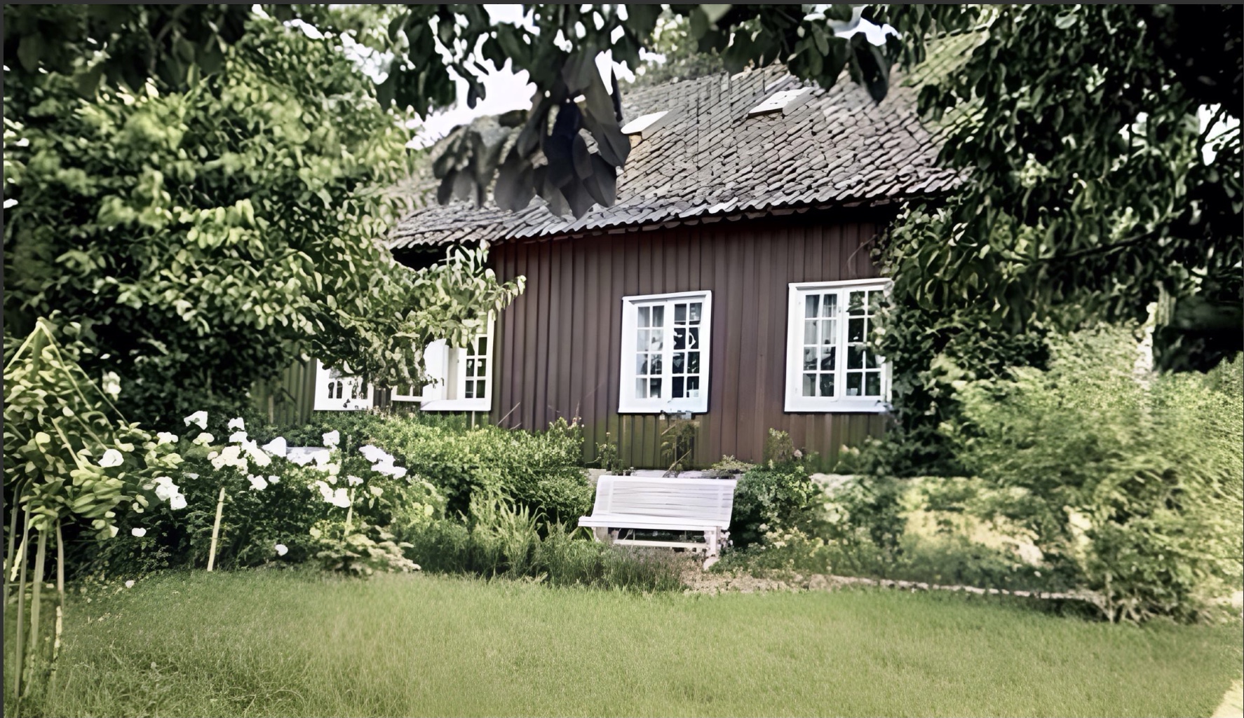 I den eine enden av huset lå spisestua. Her va det blant mange ting gardiner, blomsterpotter og ein kanarifugl. Ute va det store lønnetre og ein stor mur. Rundt i hagan gjekk det gangar av sand.