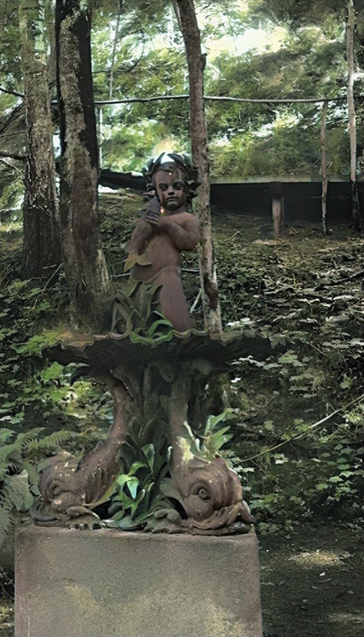Den første fontena blei fløtta hit te Grotten, da nytt damanlegg blei bygd i parken. Detta va et meir uformelt og skyggefullt område enn resten av hageanlegget. Området har trulig vært favorittdelen av parken for August Cappelen. Her va det meir tilfeldighetene som rådde og ikke det strukturerte som ein fant ellers i parken. Her va det lite sollys og dødt løv og rester etter år som va gått og «ikke det horeri av farger som vi kaller tidlig vår», som ein kunstnar sa!