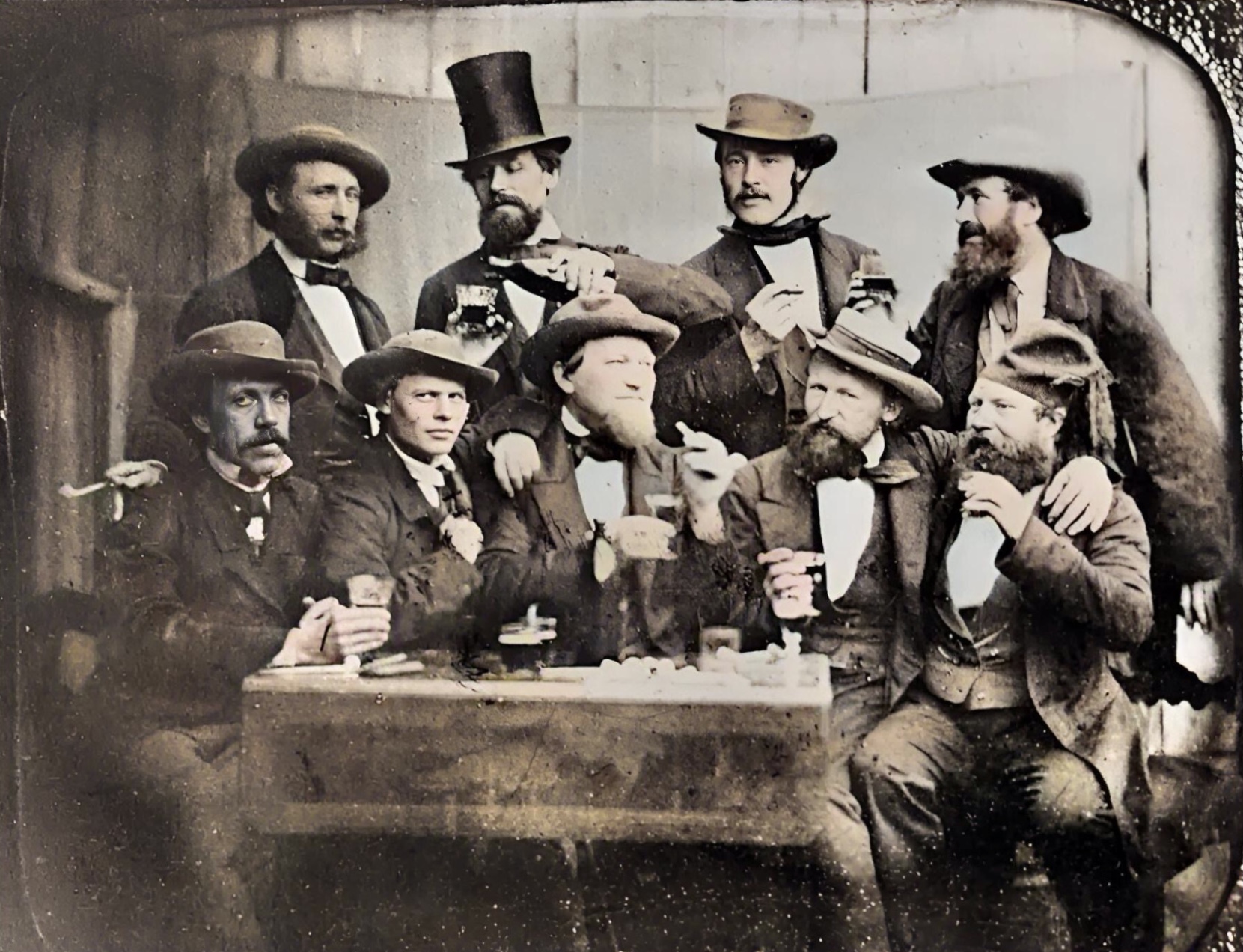 På dagtid i Tyskland va August opptatt med å få maleundervisning. På kveldane samla studentane seg på kroene og svingte sine beger. Her ser vi August oppe te venstre. Vi ser også andre norske malere i fotografiet: Hans Gude, Amaldus Nielsen, Adolph Tidemann, Johan Frederik Eckersberg og Olaf Isaacsen.