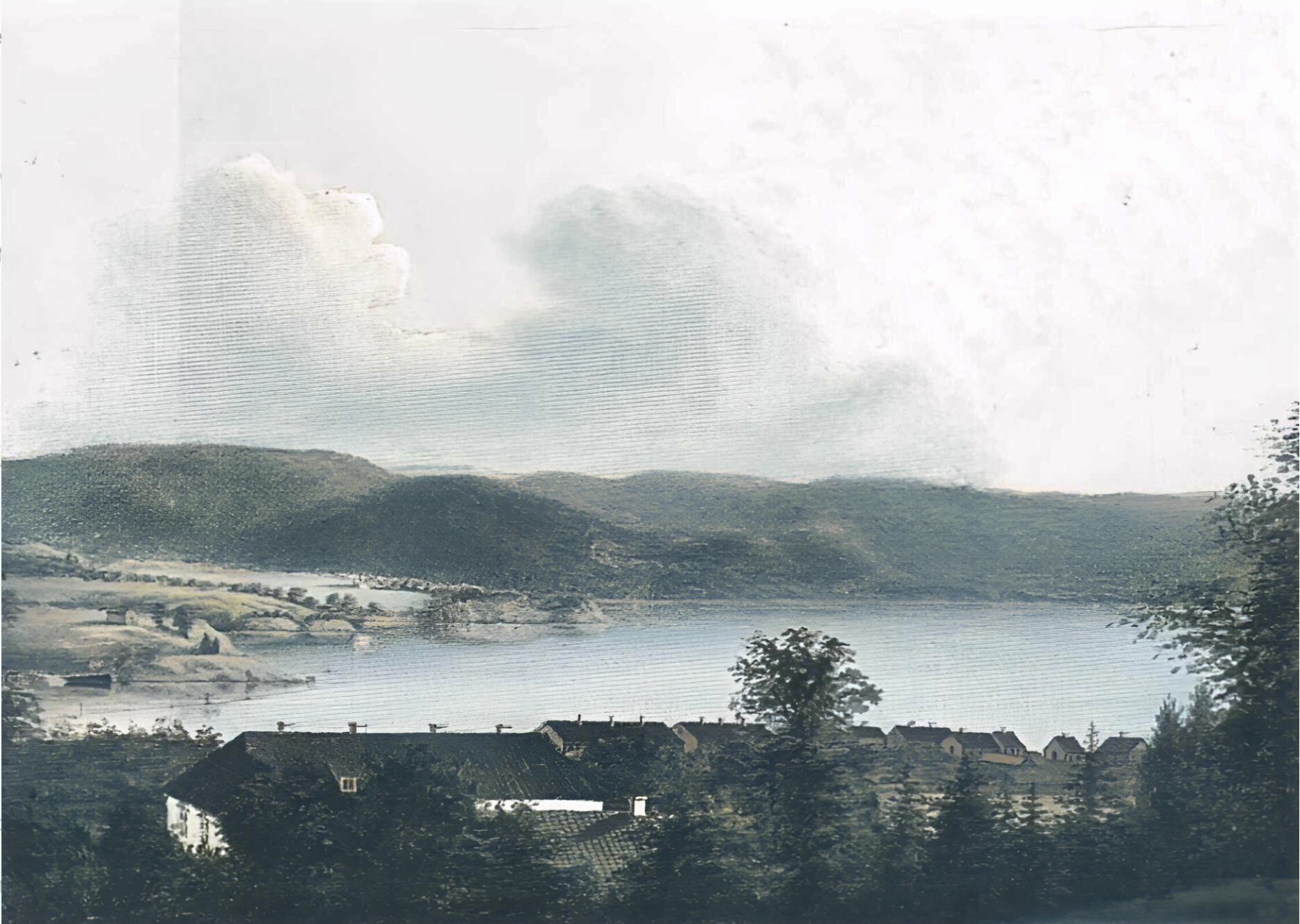 Vi ser litt av Øvre Verket og halvøya borte på Romnes. Det er vanskelig å si sikkert, men noen av husa på Øvre Verket kan siden ha blitt rivd og andre kan siden ha kommi te. De kan i så fall ha blitt fløtta fra andre steder, muligens inne fra parken i Holden.