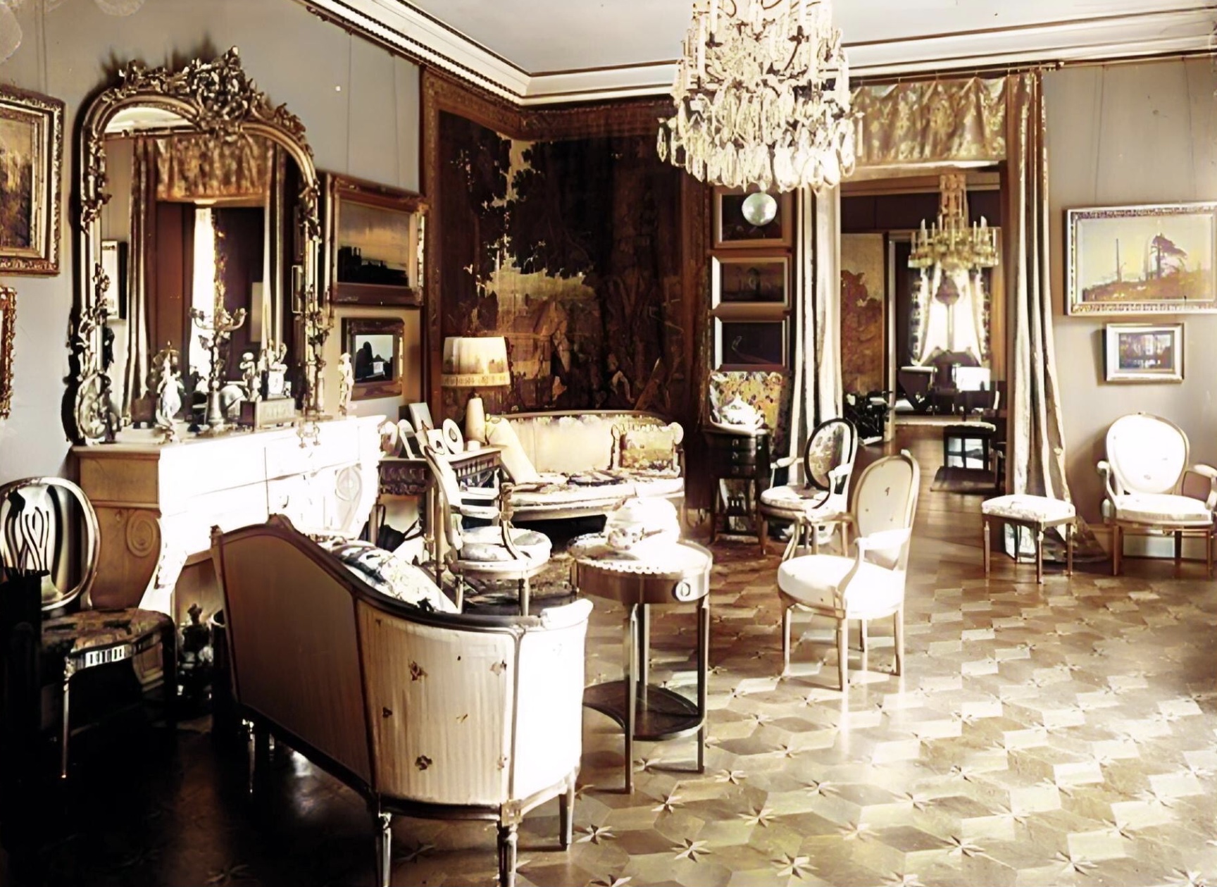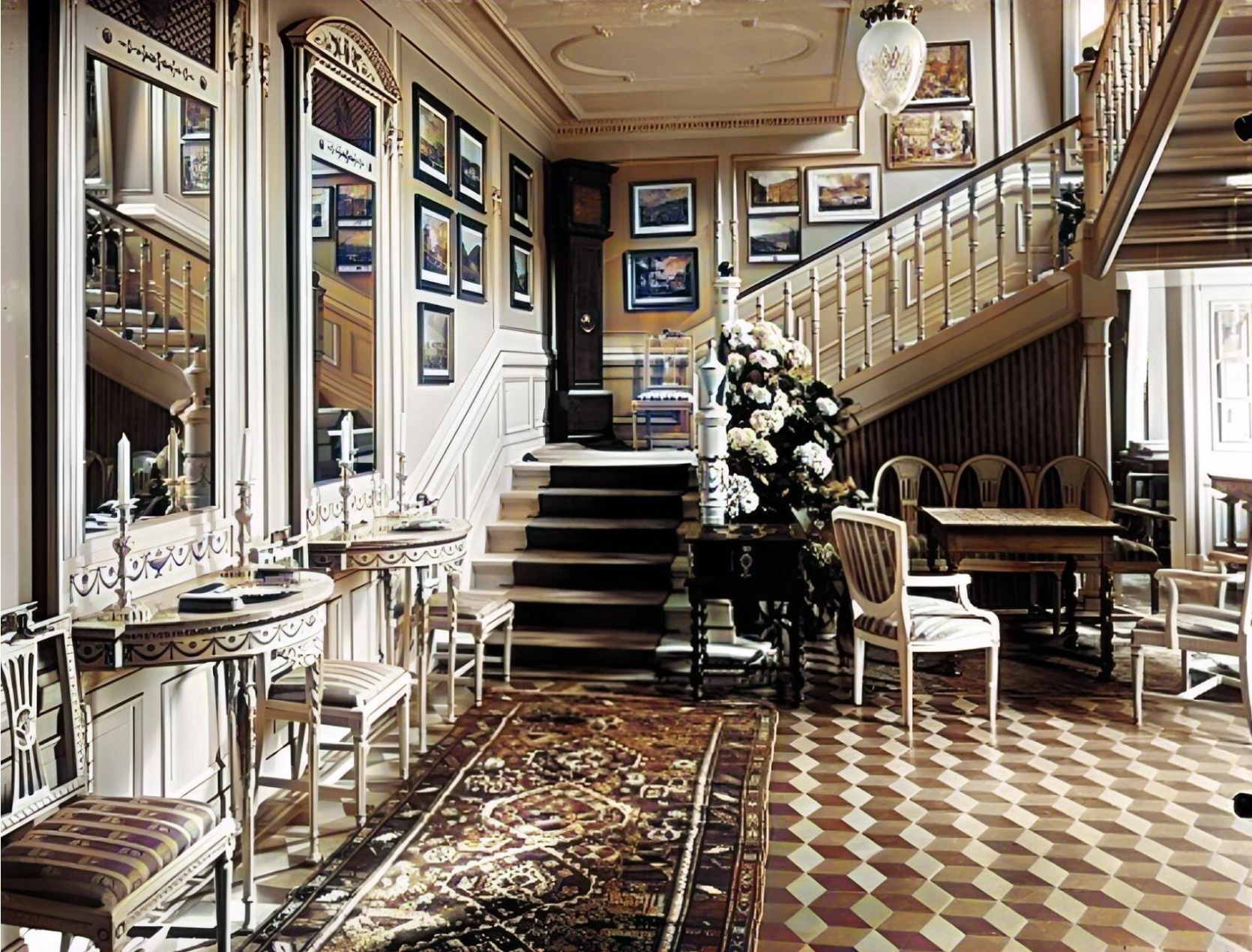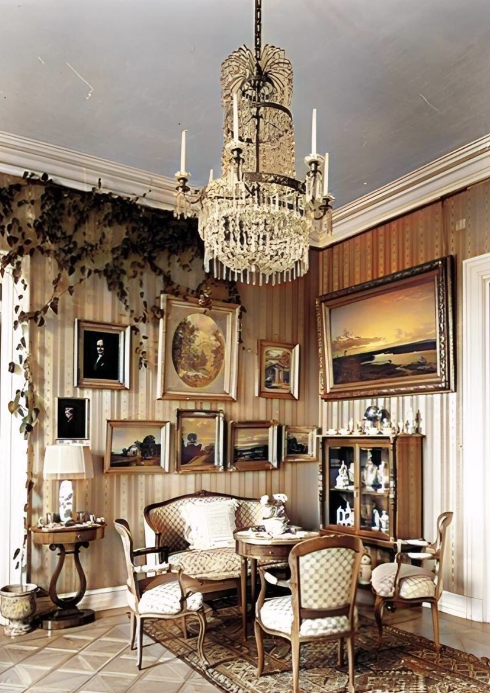 Legg merke te det flotte gulvet lagt i fiskebeinsmønster og de enormt breie og profilerte taklistene med gipsstukkatur.