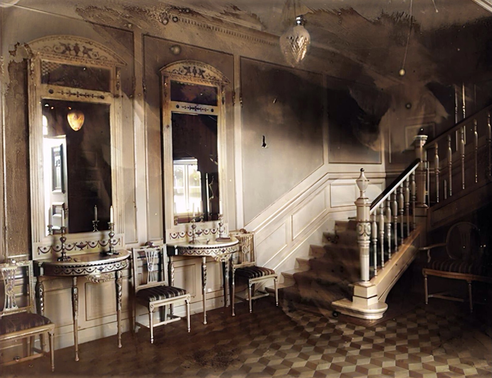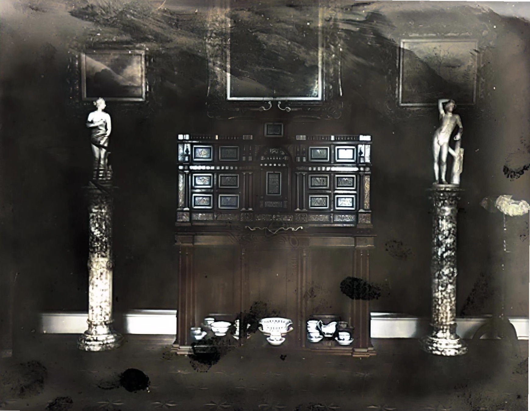 Nasjonalromantisk kunst på veggane og gresk/romerske søyler med figuriner……. Detta va høyeste mote i 1900, om du hadde pengane te det!
