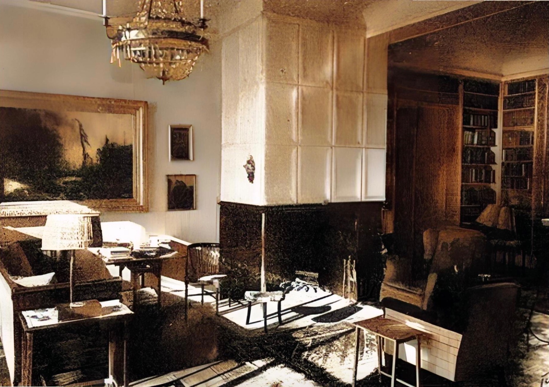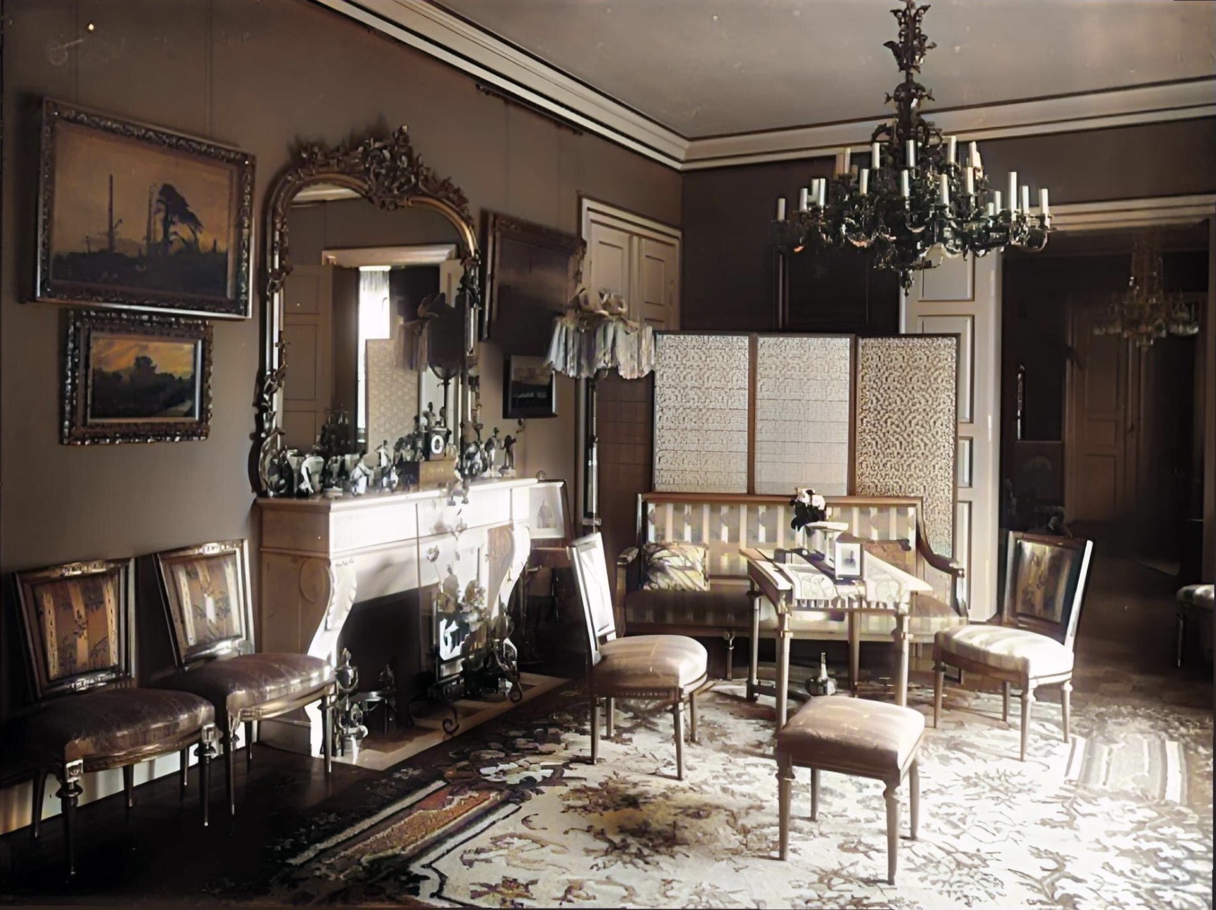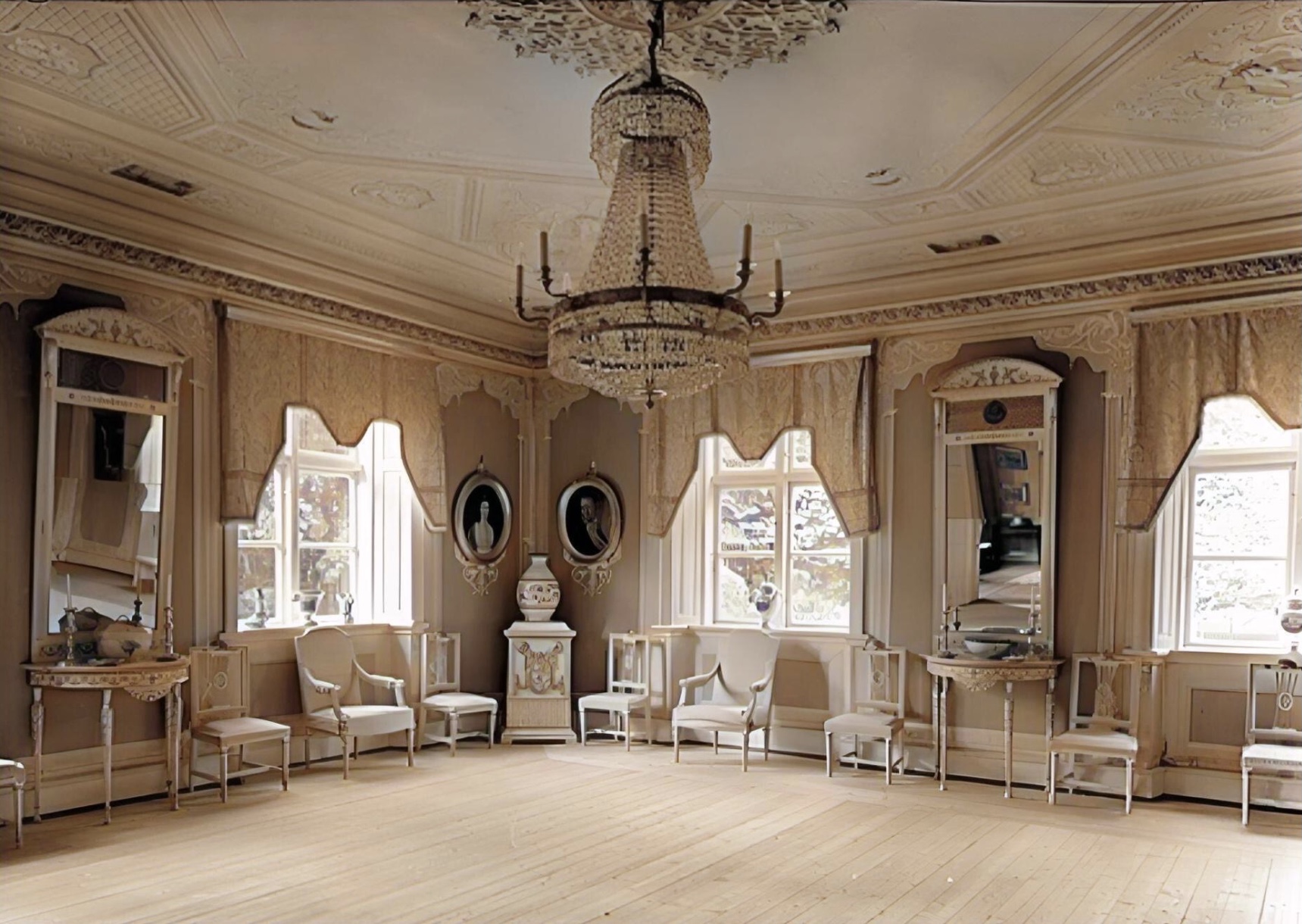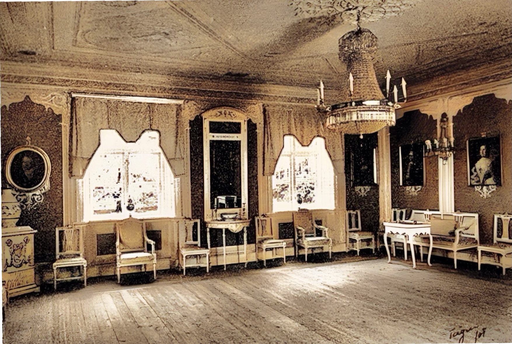Jeg sier som Per Aabel ville ha sagt: « For et deilig rom!» Detta rommet gikk under navnet «den blå salen» og her har det blitt engasjert og dansa etter wienervals så silkekjolane stod som seil. Og de unge fylte sine dansekort og så lengselsfullt etter sine lieblinger, mens de eldre satt langs veggane og nikka anarkjennande og drakk av sine krystallglass! Så fekk musikken som va leid inn beskjed om å ta en masurka!