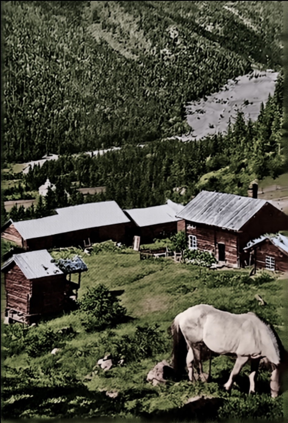 Vi ser så vidt huset med uthuset i framkant og lauvtreet ved siden av. Huset i midten va familien Bjørnstad sitt og de hadde og dreiv kolonialbutikk i mange år.