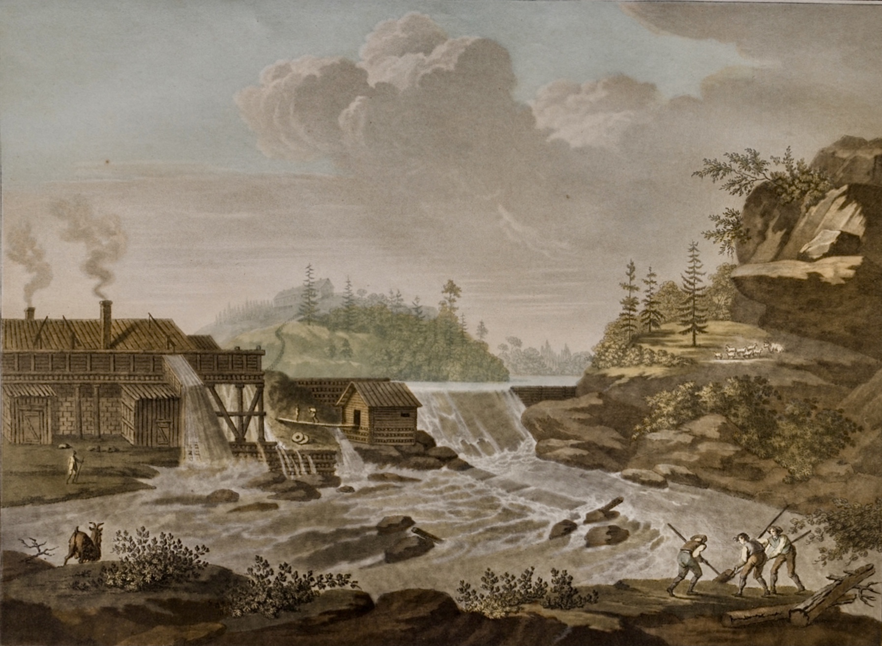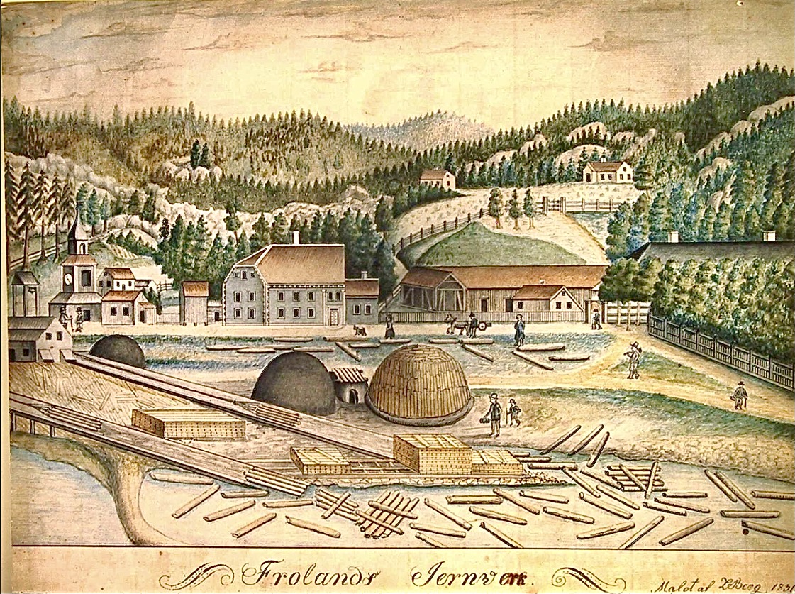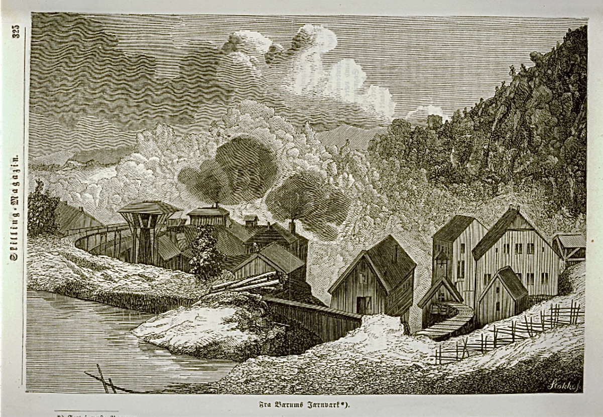 Et gammalt maleri som viser jernverket te venstre og boligen te brukseieren i midten. Her kom Voldsfjorden heilt inn og frakt av god malm fra sørlandsgruvene va enkelt. Her har også Halvor Borse hatt skipsbyggeri.