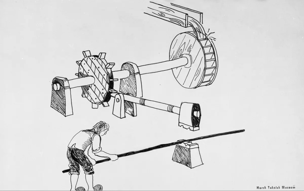 Her ser vi hvordan hammaren kommer ned og bankar jernet te den forma som ønskas. Krafta te denna prosessen i Holla kom fra ulefossen.