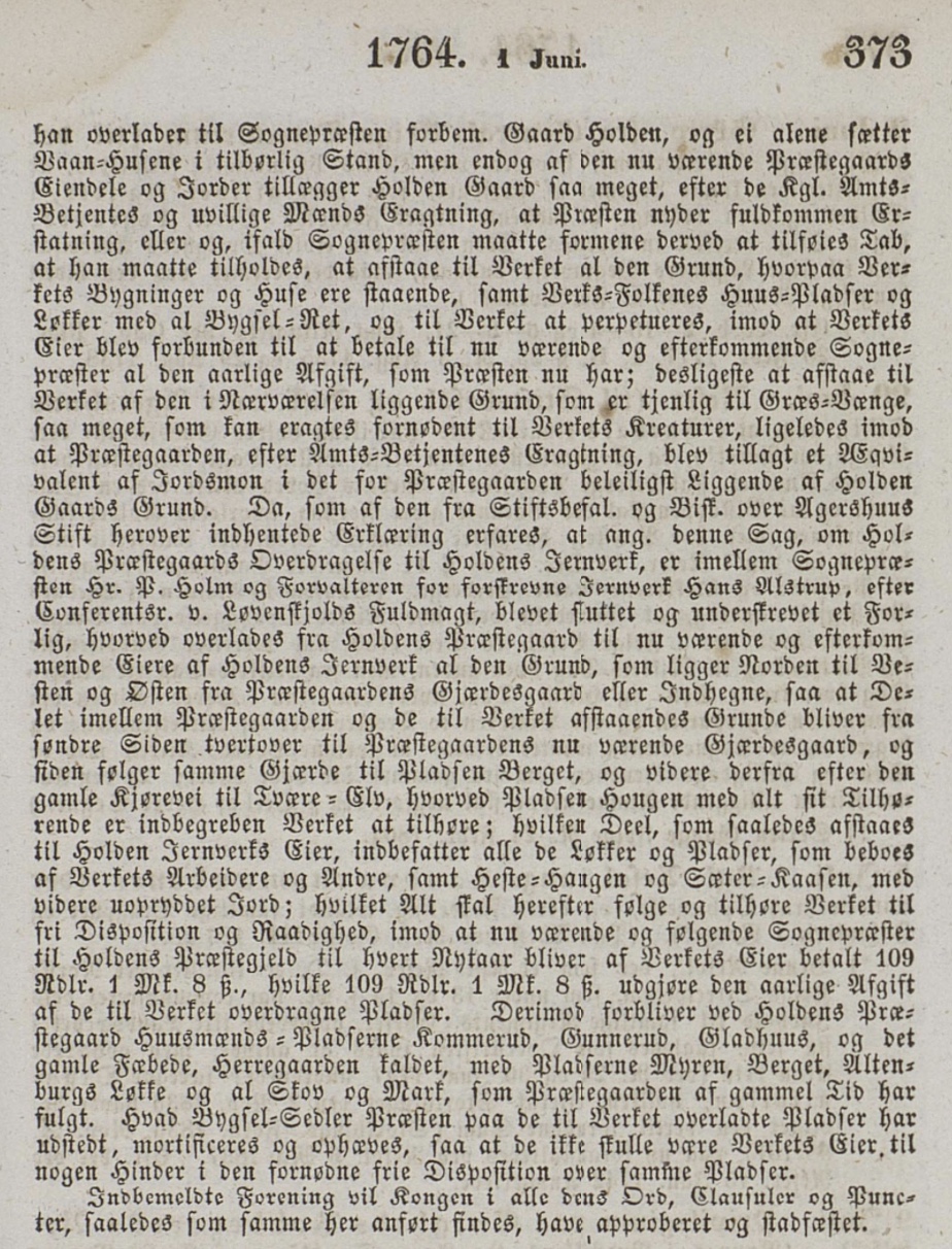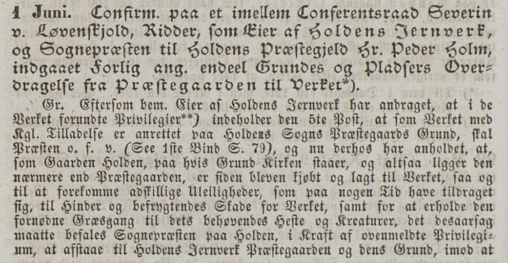 1. juni 1764 blir det et forlik mellom Severin von Løvenskiold og hollapresten Peder Holm. Forliket gjekk på uoverstemmelsar rundt vilkåra fra 1672: