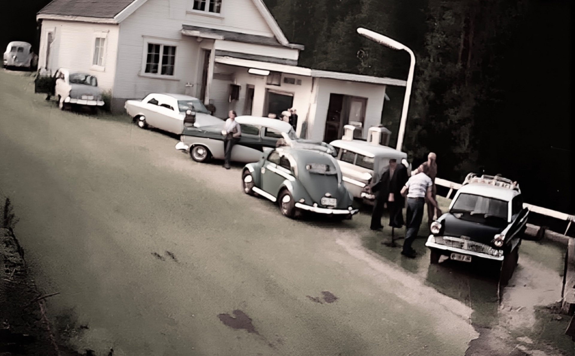 Kiosken ved slaktar Brugård balanserte heilt ute på kanten av skrenten. Her samla de unge voksne seg og da særlig i sommarhalvåret. Heile parkeringa mellom sanitærbygget og slusevoktarboligen va full. I denna kiosken smaka jeg min første bitter lemon og grape soda og de va mine venner siden.