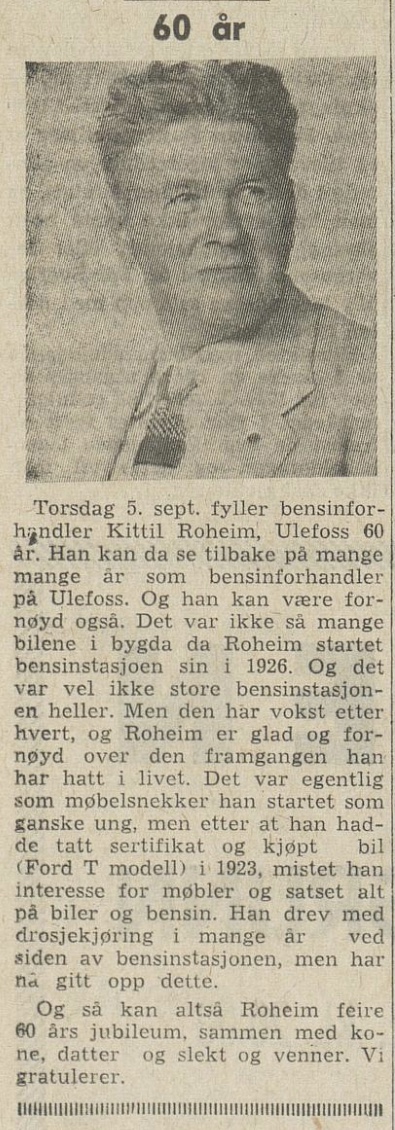 Før vi kunne kjøre heim te Eidsbygda, hendte det at bilen måtte få litt mat! Da svinga vi innom Kittil Roheim (1903-1986). Han kom ut å fylte bensin og pussa frontruta om det trengtes. Ein sjekk av olja kunne du også få, men pølser og burgere glimra med sitt fravær hos Kittil. Lyspærer og anna nyttige ting for problemfri kjøring kunne han varte opp med. Han hadde ei pumpe for bensin og ei for disel. Jeg huskar rundt 1970. Da fekk jeg av Kittil ei papplate med utsparingar te «sølvmyntar» med ulike motiv i forbindelse med månelandinga. Disse myntane måtte samlas/kjøpas for å fylle papplata. Kittil va i 1920 snekkerlærling hos Halvor Aaland lenger nede på Lanna. Kittil va født på Odden og faren hadde vært agent for ein maskinforretning i Kristiania. Før Kittil starta opp sin bensinstasjon, hadde han ein perode hos AUB og laga dørar: