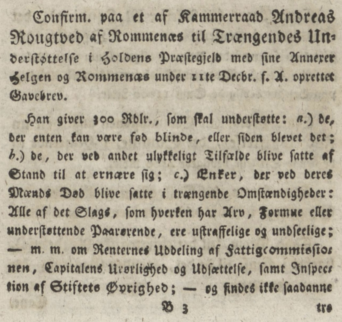 «Min kjærlige mand, kammerraad Andreas Rougtvedt, sin tids foged over nedre Tellemarken og Bamble, hjemkaldte Gud til sig i gaar middag, ved en stille og rolig død, i hans alders 82de aar, og efter 38 aars kjærligt ækteskab med mig, som han er evig uforglemmelig og velsigner hans minde. Dette for mig smertelige tab giver jeg mig herved den ære, sørgeligt at communicere hans og mine fraværende beslægtede og venner, om hvis ømme deeltagelse jeg forvisser mig, uden skriftlig bevitnelse»