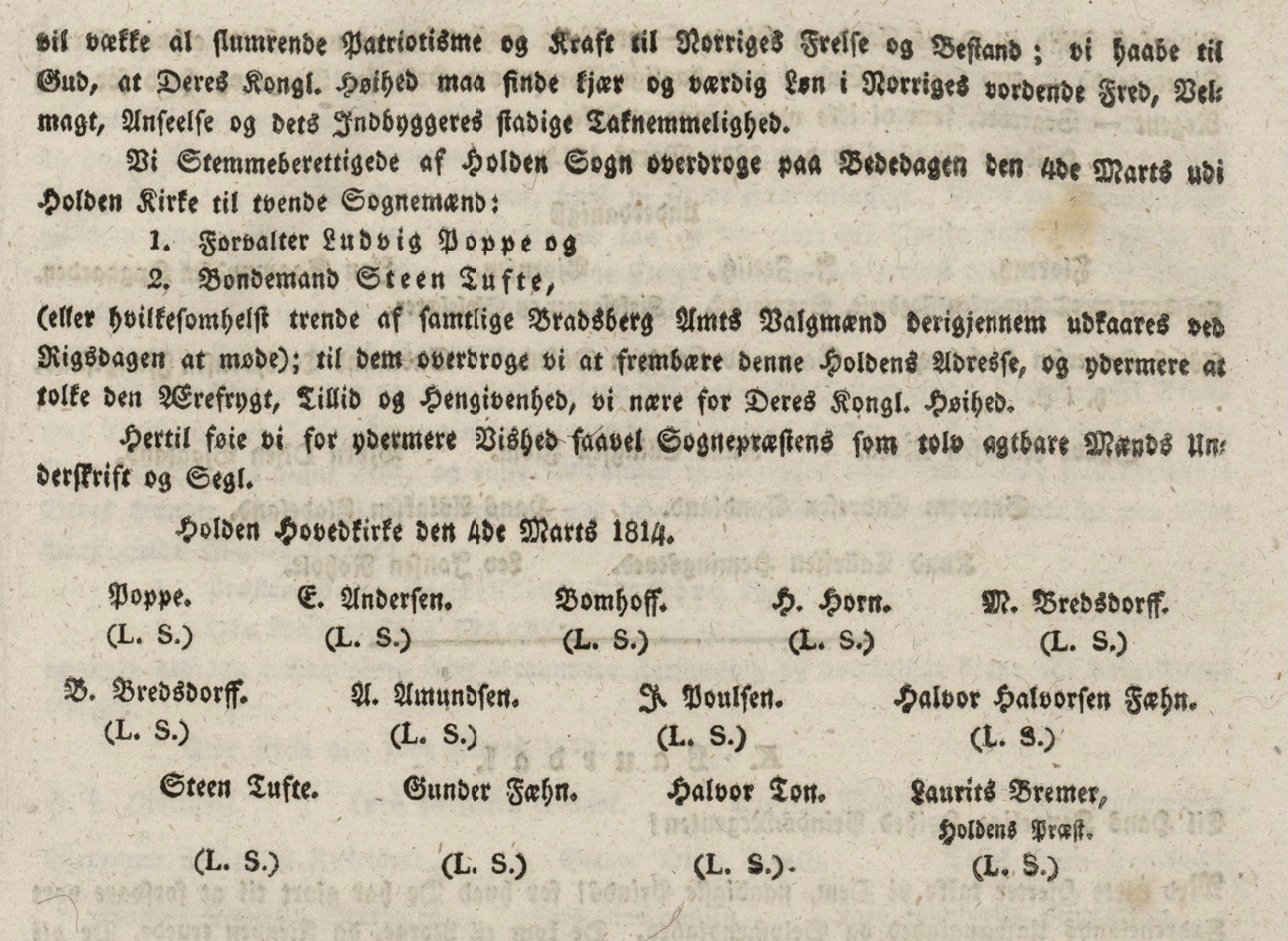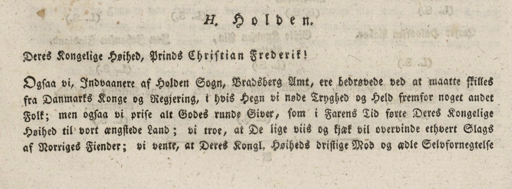 I mars 1814 går det et brev fra Holla te prins Christian Frederik i Danmark. Innbyggerane va bedrøva og lei seg for å måtte skille seg fra Danmark sin konge og regjering. Vi hadde nytt godt av å tehøre Danmark. Vi tror at De gjennom Deres klokskap vil overvinne Norges fiender og at dette ville vekke all slumrende patrotisme.