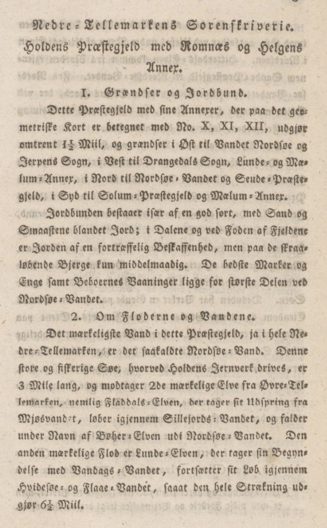 Det merkeligste vannet i dette Prestegjeld, ja i hele Nedre Telemarken, er det såkalte Nordsøe-Vann. Denne store og fiskerike sjø, hvorved Holdens Jernverk drives, er 3 mil lang, og mottar 2de merkelige elver fra Øvre Telemarken, nemlig Fladals-Elven, der tar sitt utspring fra Mjøsvannet, løper igjennom Siljord's Vann, og faller under navn av Bøher-Elven uti Nordsøe-Vannet. Den annen merkelige flod er Lunde-Elven, der tar sin begynnelse med Bandaksvannet, fortsetter sitt løp igjennom Hvidesøe- og Flaae-Vannet, saaledes den hele strekning utgjør 6 ½ mil.