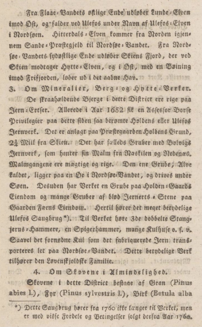 De skrånende fjell i dette distrikt er rike på jernmalm. Allerede i år 1652 fikk en assessor Borse privilegier på dette siden så berømte Holdens eller Ulefos Jernverk. Det er anlagt på prestegården Holdens grunn, 2 ¾ mil fra Skien. Det har således gruver med Bolvig Jernverk, som henter sin malm fra Næsfjellene og Nedenaas. Malmgangene er mektige og rike. Den ene gruve, «Alvsåker» kalt, ligger på en øy i Nordsøe-Vannet, og drives under sjøen. Dessuten har verket en gruve på Holden gårds eiendom og mange gruver av bløtjernets stene på gården Feens eiendom. Hertil hører det meget betydelige Ulefos Sagbruk (*).