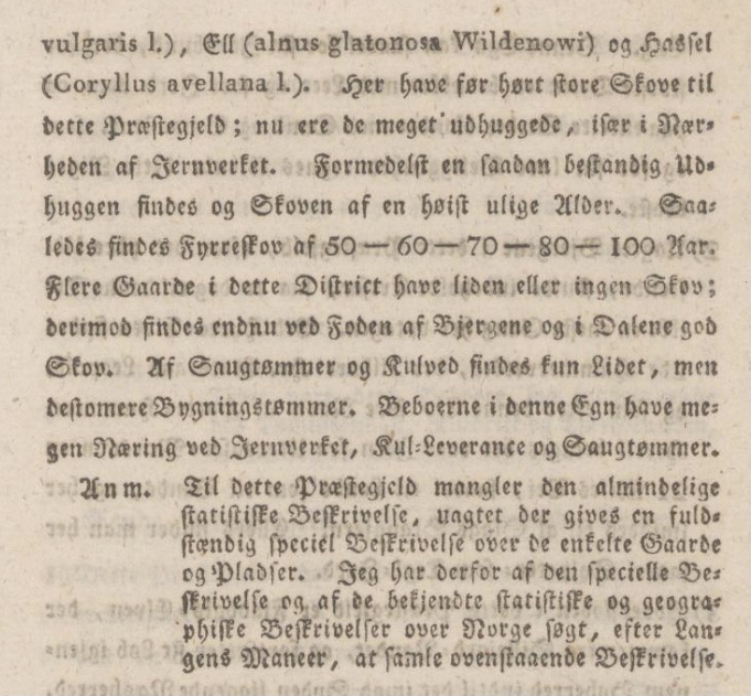 Skogene i dette distrikt består av gran (Pinus abies L.), furu (Pinus sylvestris L.), bjørk (Betula alba vulgaris L.), or (Alnus glutinosa Wildenowii) og hassel (Coryllus avellana L.). Her har før vært store skoger til dette prestegjeld; nå er de meget uthogde, især i nærheten av jernverket. Fornemmelig en sådan bestandig uthuggen finnes og skogen er av en høyst ulik alder. Således finnes furufall av 50 – 60 – 70 – 80 – 100 år.