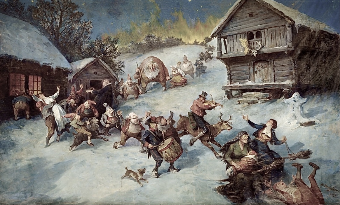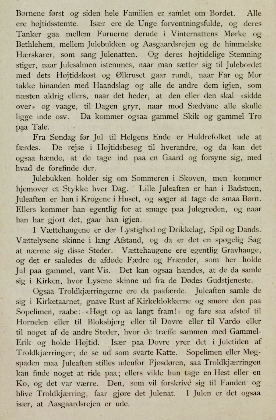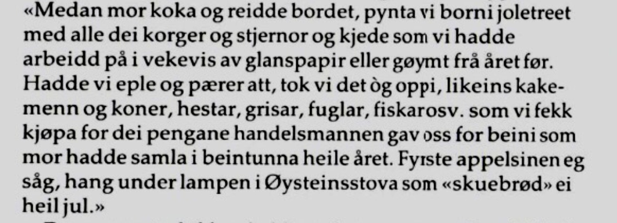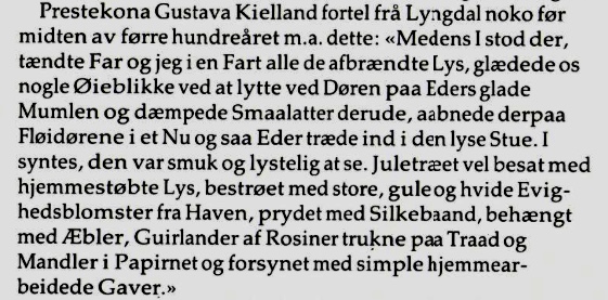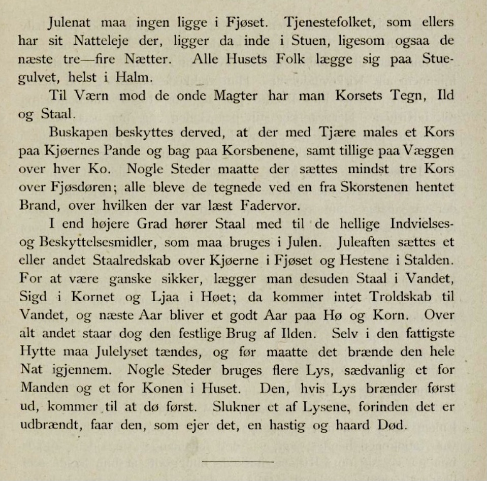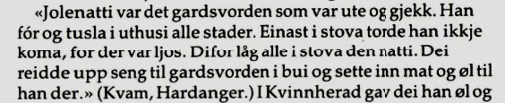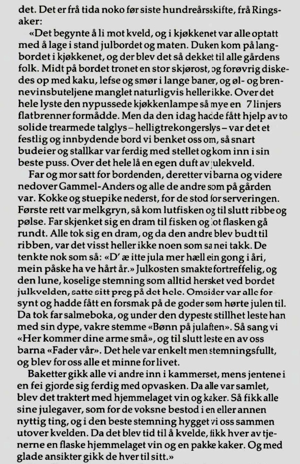 Nå va de nybada og i finstasen og julehøytida kunne komme. De som budde et støkke unna kunne ikke høre kjerkeklokkene ringe. De måtte skyte jula inn sjøl heime på gården i skumringa. Dette fungerte også som beskyttelse mot onde krefter som kunne komme i ly av mørket. Julenatta va den skumlaste tida, så det gjaldt å væra på vakt!