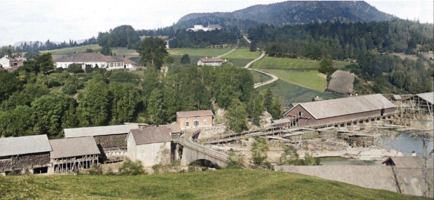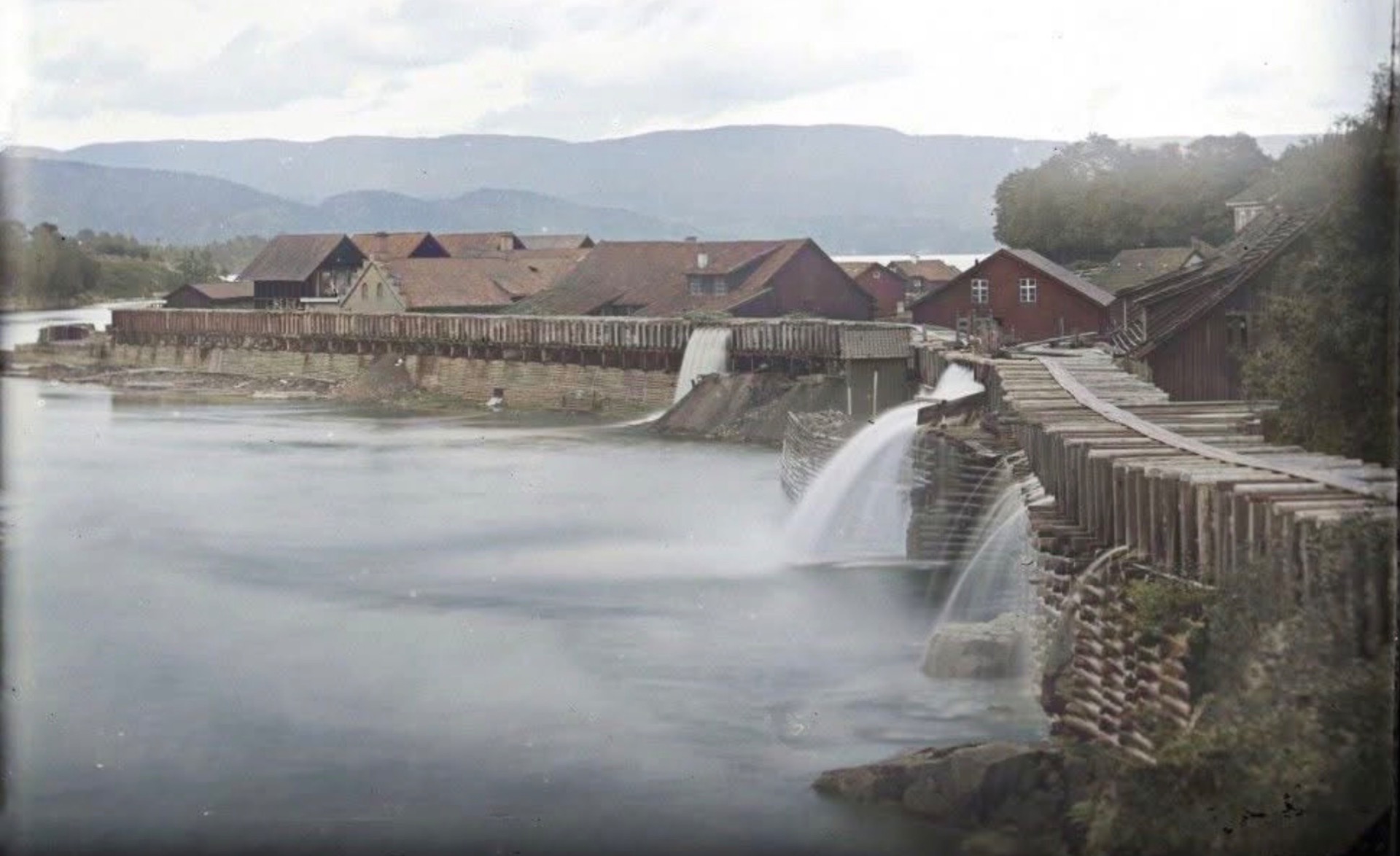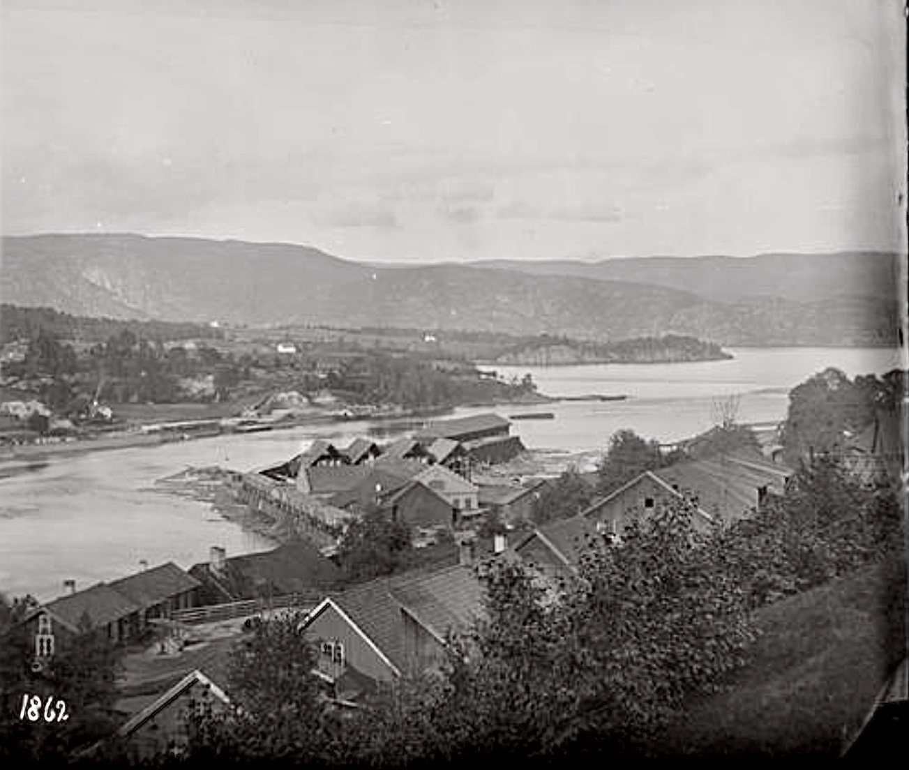 Vi ser på andre sida av elva mange og store bygningar. Ein av disse er det vi bare ser taket på i forrige bilde. Dissa lå i området der gamlebanken ligger på Krøsset. Holden Forbrugsforening lå i detta området og starta opp i 1870. Fra gamle fotografi veit vi at det va malt hvitt. Det burde ha liggi der de store bygningane ligger. Mye tyder derfor på at fotografiet er fra 1860 åra.