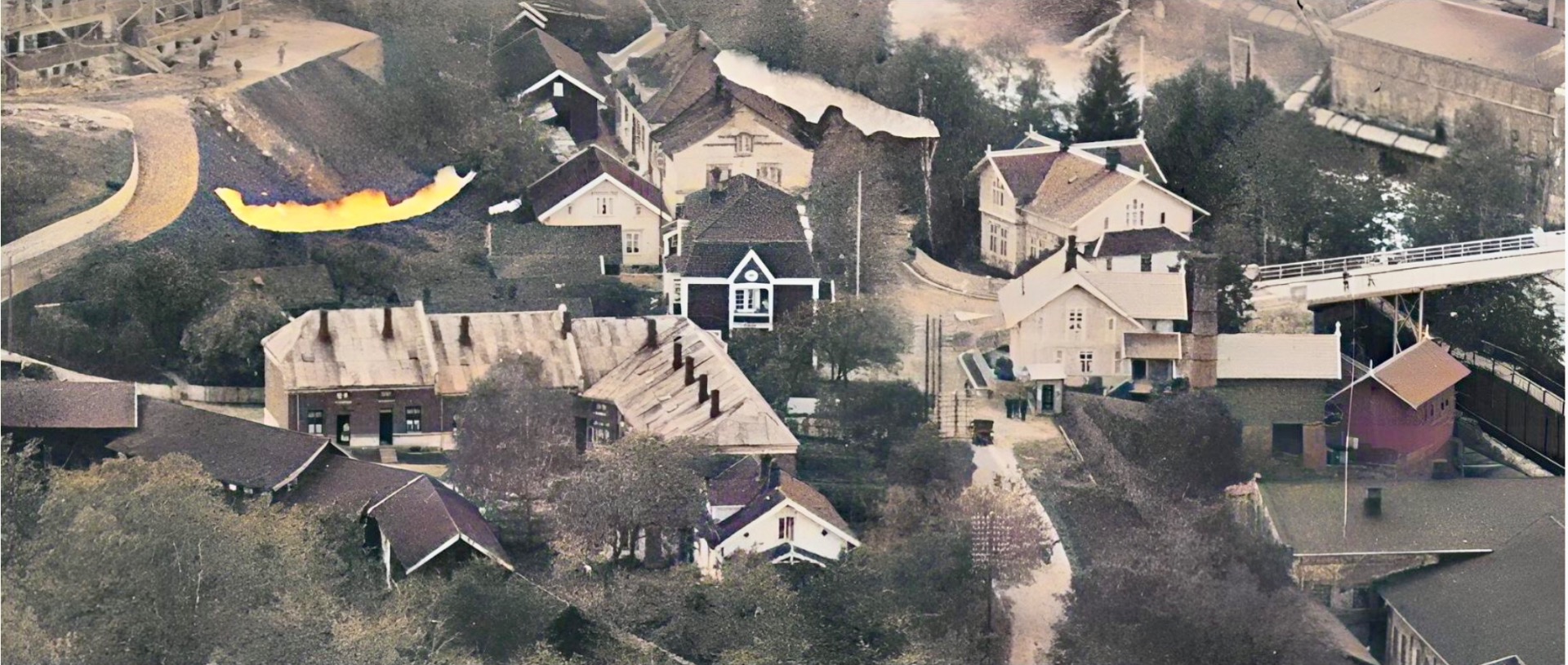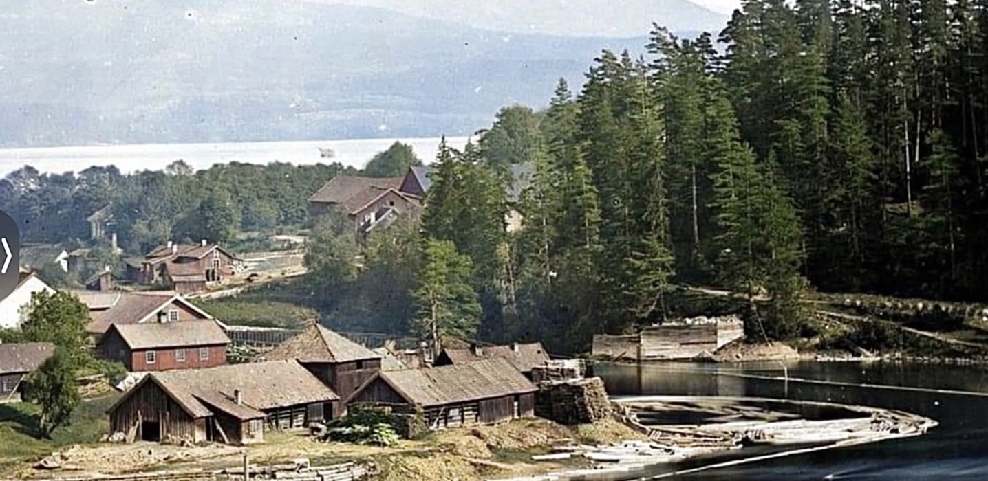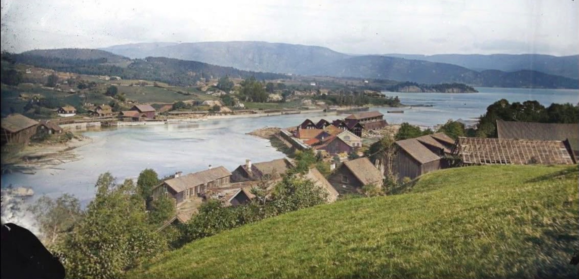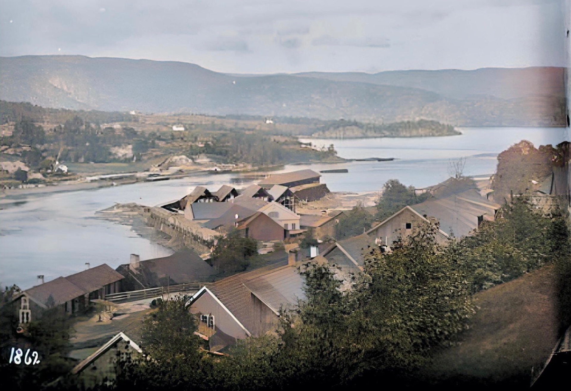 Vi ser på andre sida av elva mange og store bygningar. Ein av disse er det vi bare ser taket på i forrige bilde. Dissa lå i området der gamlebanken ligger på Krøsset. Holden Forbrugsforening lå i detta området og starta opp i 1870. Fra gamle fotografi veit vi at det va malt hvitt. Det burde ha liggi der de store bygningane ligger. Mye tyder derfor på at fotografiet er fra 1860 åra.