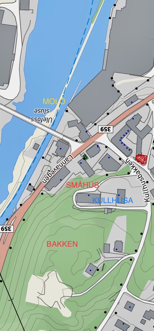 Området der jeg har ført «Molo» i kartet, er der vannrenna gjør knekken sin i bildet over. Vi har minst fem tak vi ser ovafra i det første bildet. Noen av dissa bygningane er veldig store og det er ein ting te jeg biter meg merke i: De har ikke piper. Det betyr at de ikke va bolig for folk.